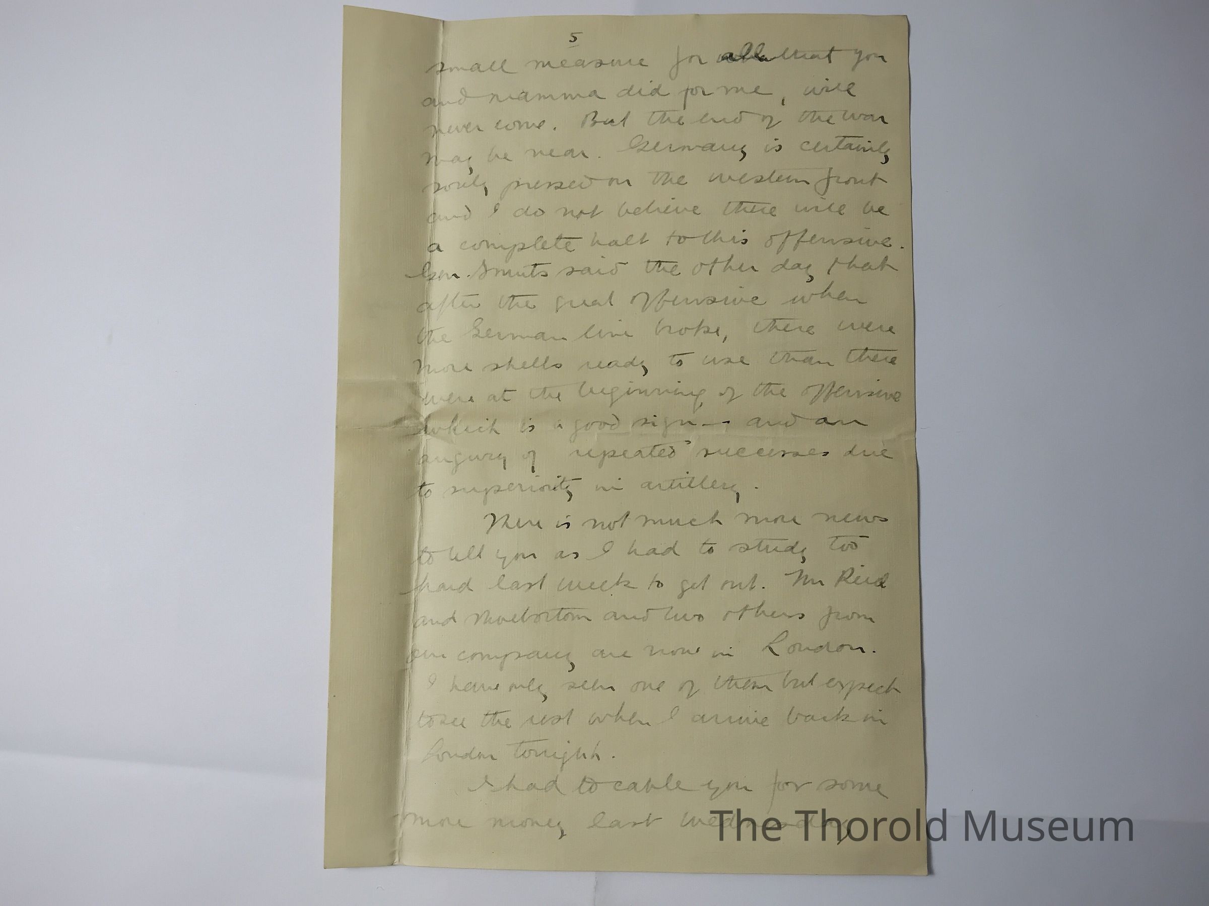 I am so glad your wrist is improving. It was too bad it happened as it was no dought extremely painful, and would also keep you back in you work. I am glad our are getting the new edition under way and only wish I was there to give out a hand with it. it just seems as though the time when I can be of some help to you to [????] You in some small measure for all that you and Mamma did for me, will never come. But the end of the war may be near. Germany is certainly surely pressed in the western front and I do not believe there will be a complete halt to this offensive. [???] [?????] Said the other day that after the [??????] Offensive when the German [????] Woke, there were more shells ready to use than there were at the begining of the offensive which is a good sign - and an answer of [??]peated successes due to superiority in artillery.