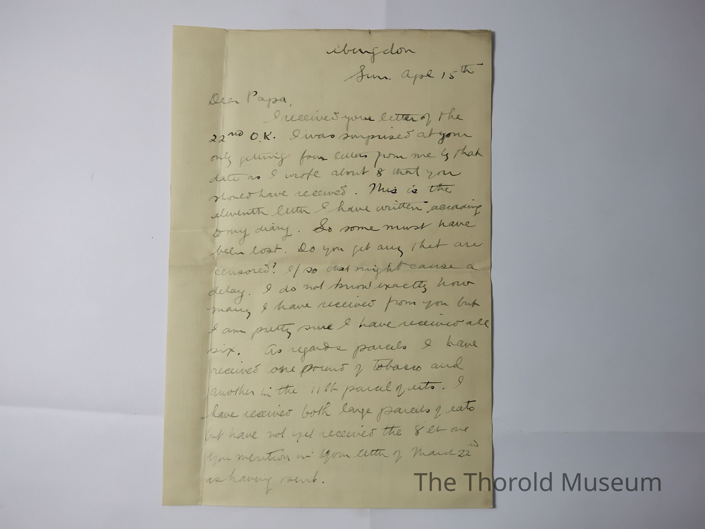 I received your letter of the 22nd O.K. I was surprised at you only getting four letters from me by that date as I wrote about 8 that you should have received. This is the eleventh letter I have written according to my diary. So some must have been lost. Do you get any that are censored? If so that might cause a delay. I do not know exactly how many I have received from you but I am pretty sure I have received all six. As regular parcels I have received one pound of Tobacco and another in the 11th parcal of eats. I have received both large parcels of eats but have not yet received the 8th one you mention in your letter of March 2nd as having sent.