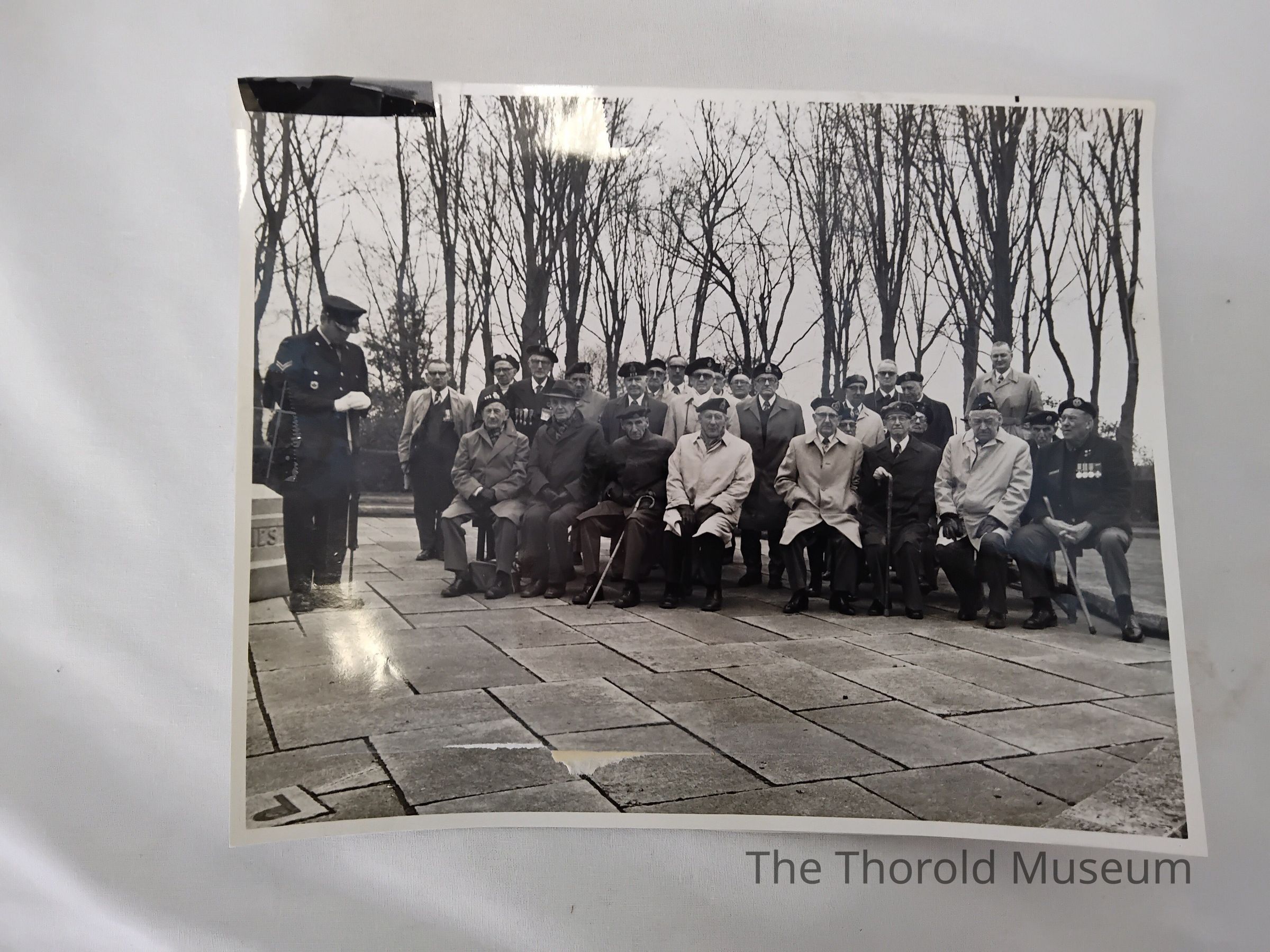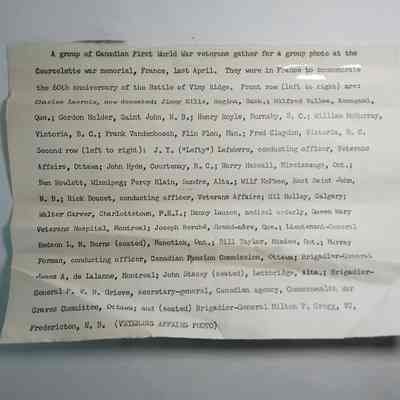 A group of Canadian WW1 veterans gathered for a group photo at courcelette war memorial in France to commemorate the 60th anniversary of the battle of Vimy RidgePhotograph Details