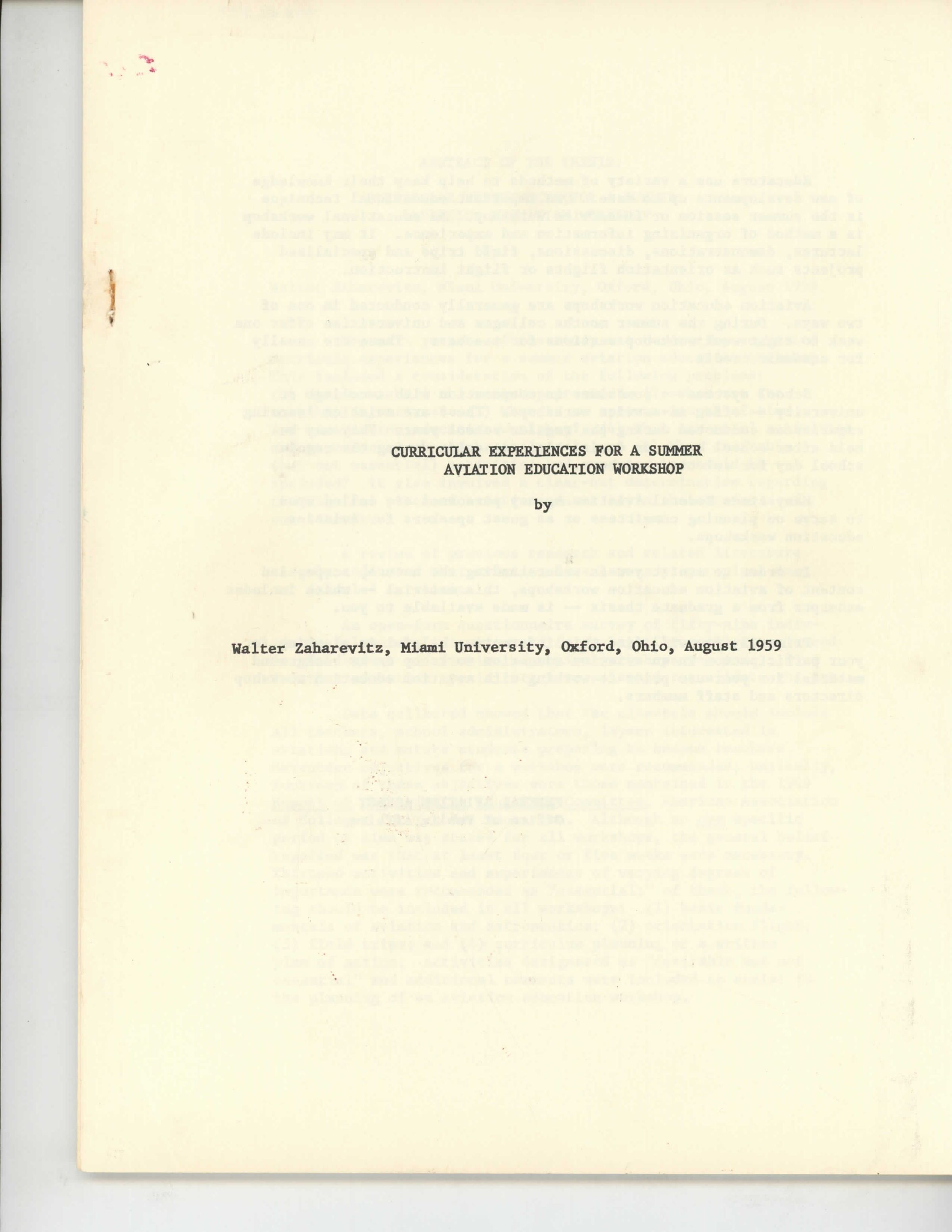 Curricular Experiences for a Summer Aviation Education Workshop