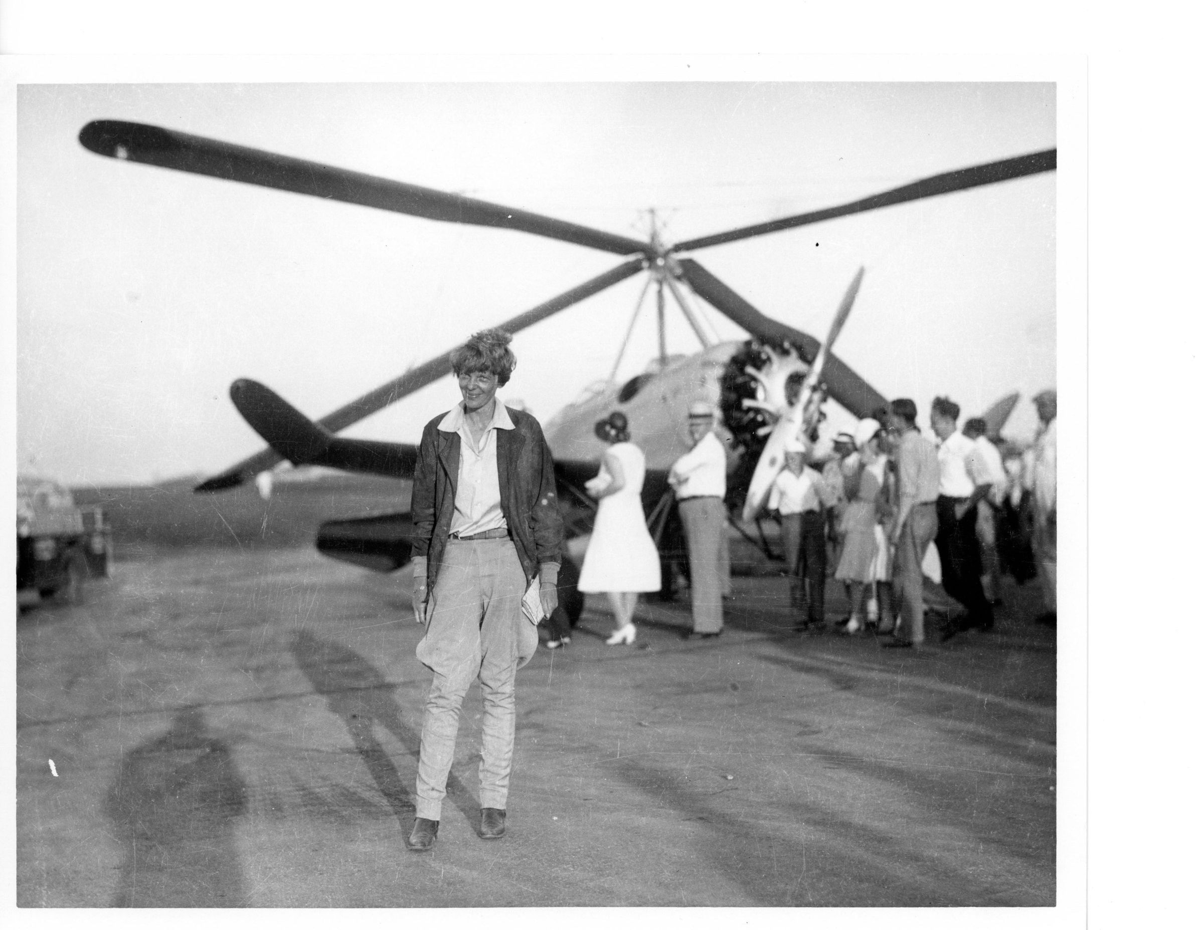 Amelia Earhart posing in front of Beechnut Gum Autogyro, Tulsa AirportDescription