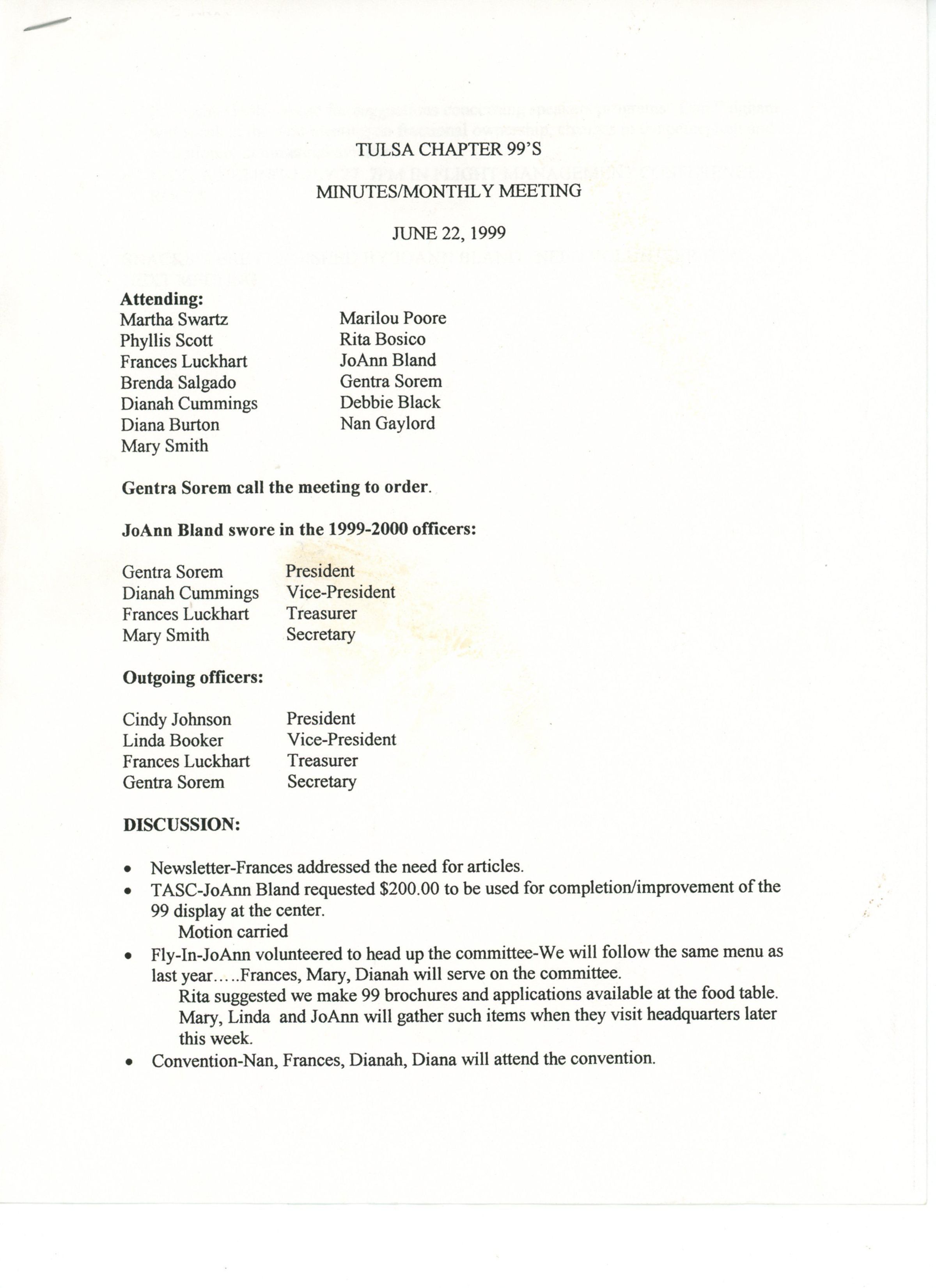 Tulsa Chapter 99's Minutes Monthly Meeting June 22 1999