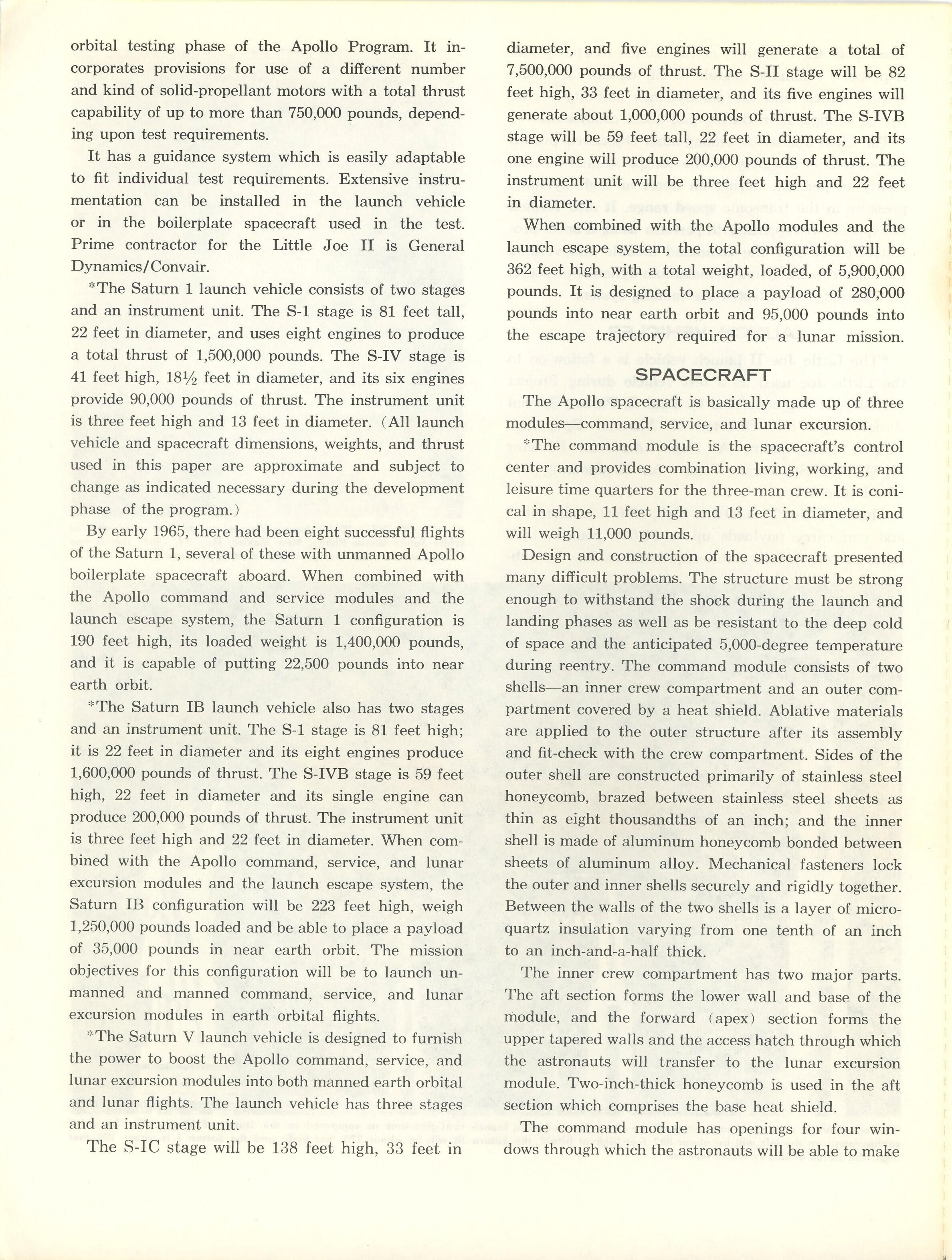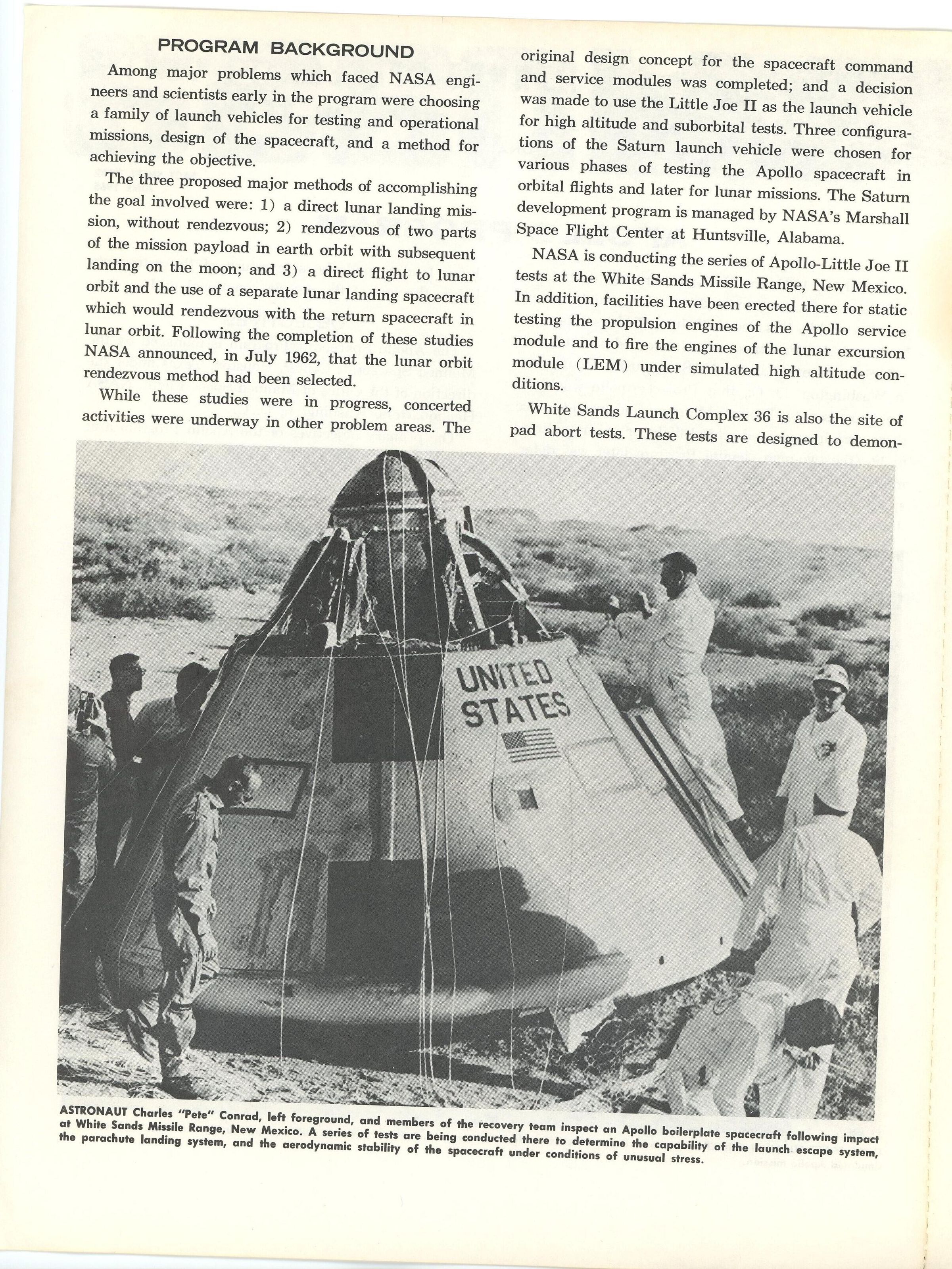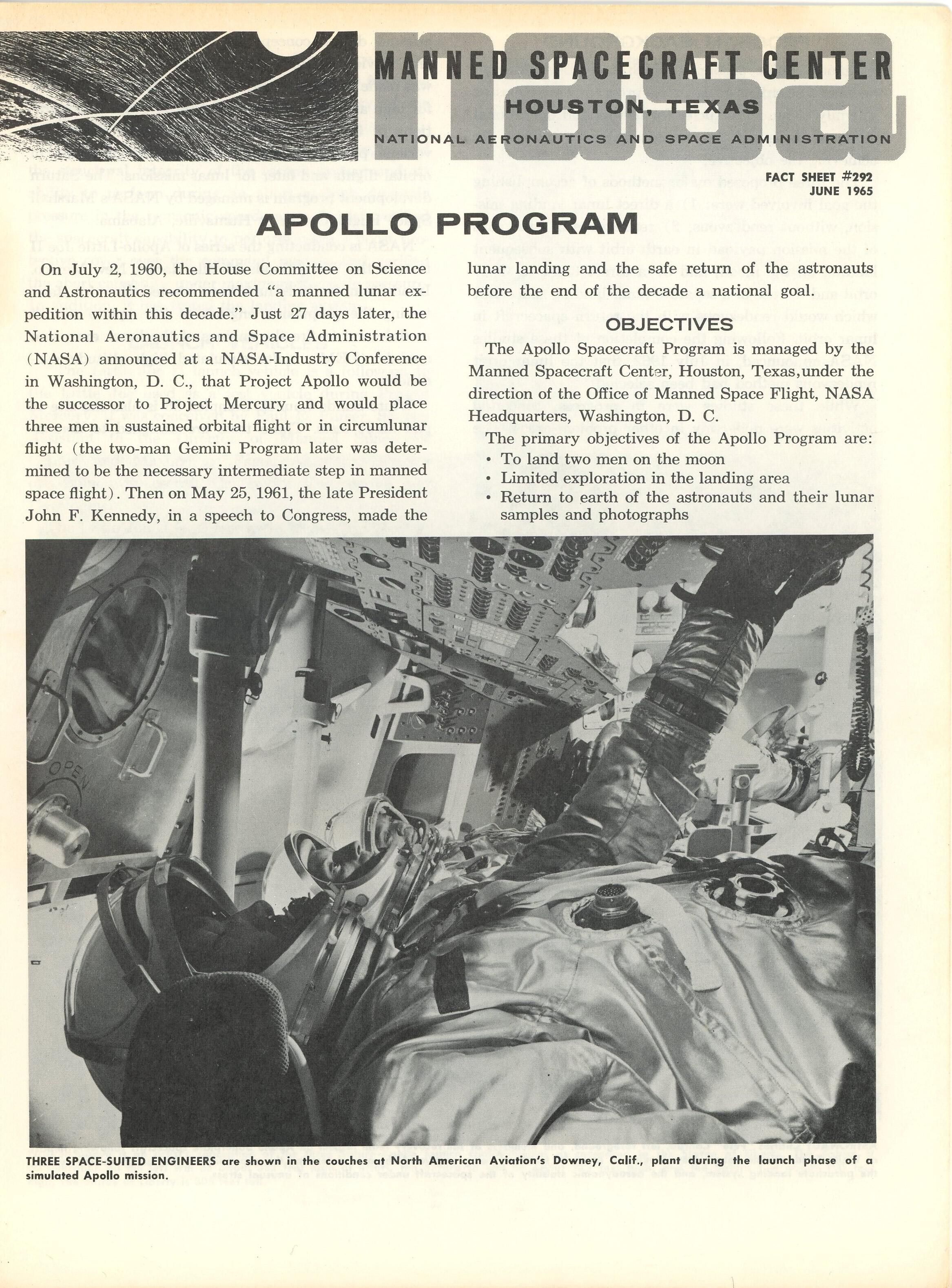 A fact sheet published by NASA in 1965 containing a short history of the Apollo Space Program including objectives, background of the program, and details of its launch vehicles, spacecraft, and subsytemsCollection