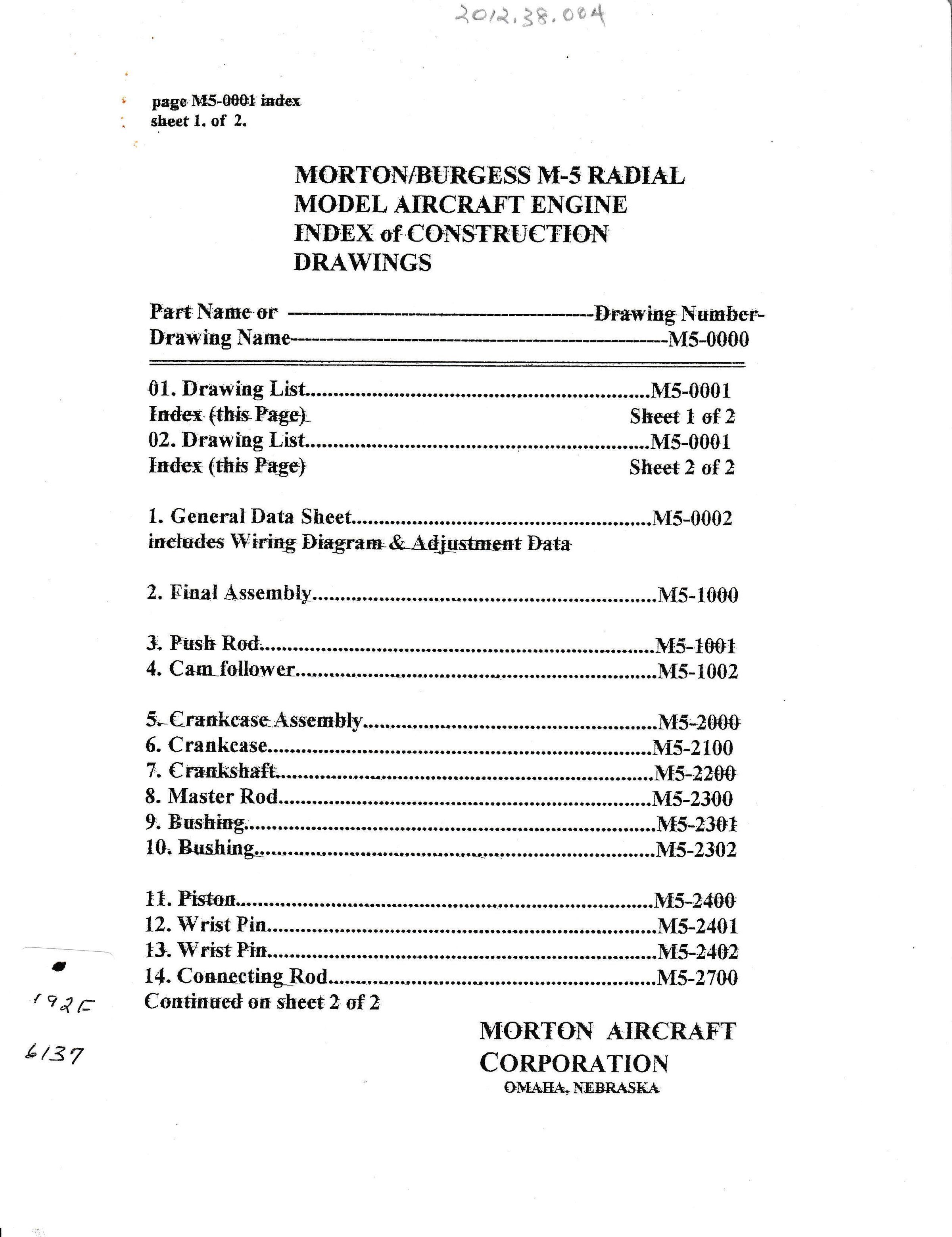 Morton/Burgess M-5 Radical Model Aircraft Engine INdex of Construction Drawings