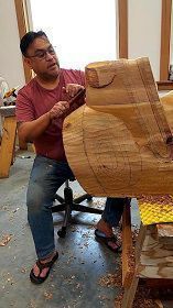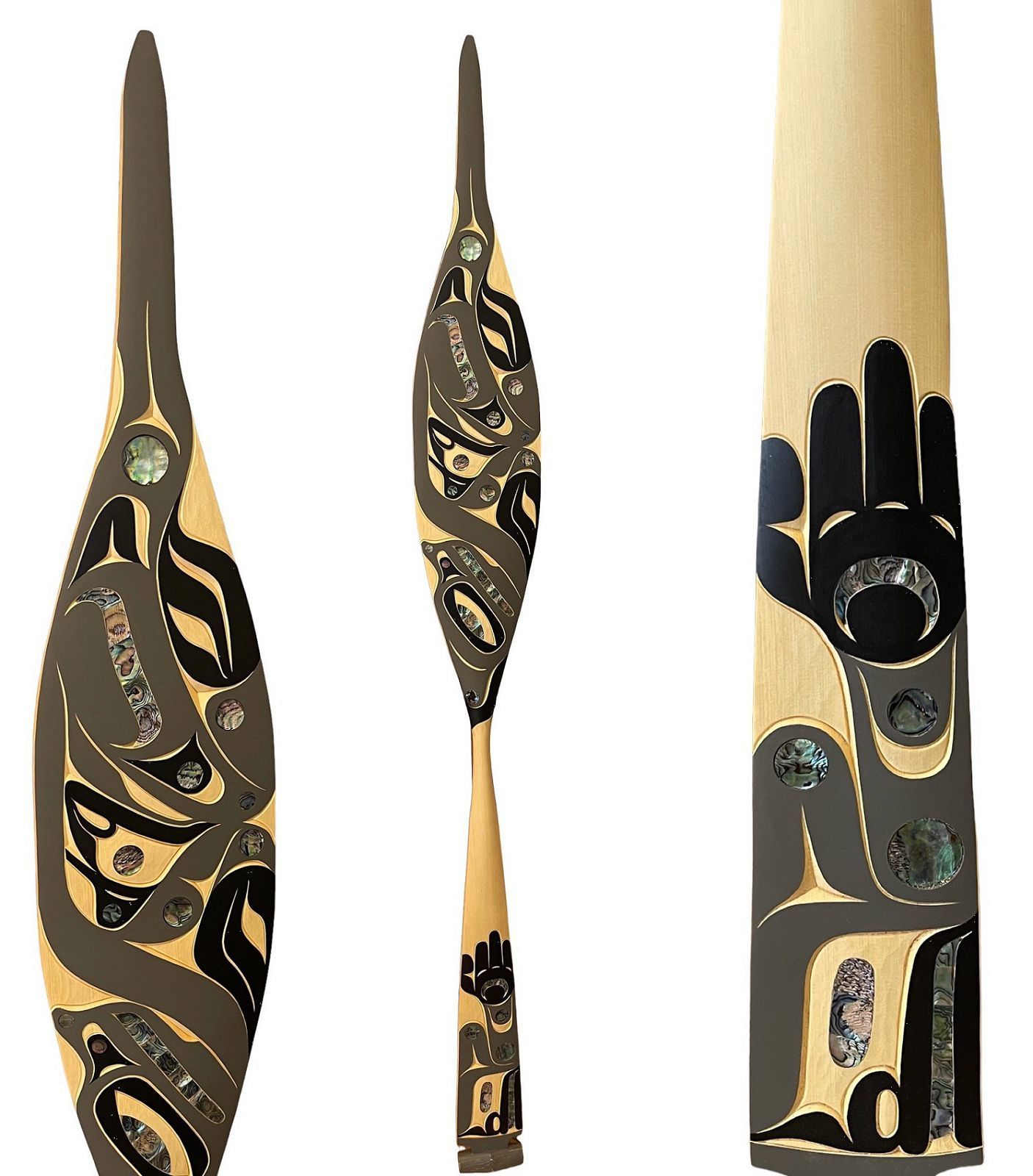 Altogether, these experiences gave him a deep understanding of Northwest Coast Art, and deeply inform his practice of carving, sculpture, jewellery-making, totem pole carving, bentwood box-making, mask-making and more. Sutherland enjoys working with and combining different materials, and he sets himself apart through exploration of different media, such as gem setting in gold and silver and silkscreen prints. He has also produced large-scale works in stone, as well as totem poles and canoes. For Sutherland, his art is fully rooted in his culture.  Sutherland’s work can be found in galleries, museums and private collections across Canada and beyond.