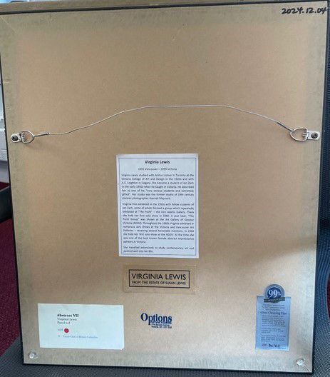 Born Virginia Sheffield Taprell in Vancouver, Virginia Lewis was an accomplished Modernist Canadian painter, active in Victoria in the 1950s and in the 1960s came to be recognized as the best known woman abstract expressionist* in the city. She studied with Arthur Lismer CC, RCA (1885—1969), member of the Canadian Group of Seven at the Ontario College of Art and Design in Toronto in the 1920s and later with A. C. (Arthur Crocker) Leighton, RBA (1901-1965) in Calgary. She moved to Victoria in the early 1950s, becoming a student at the art school of the Czechoslovakian-born artist Jan Zach (1914-1886), one of few artists teaching modern art trends at the time, known for fostering individual styles in his students.