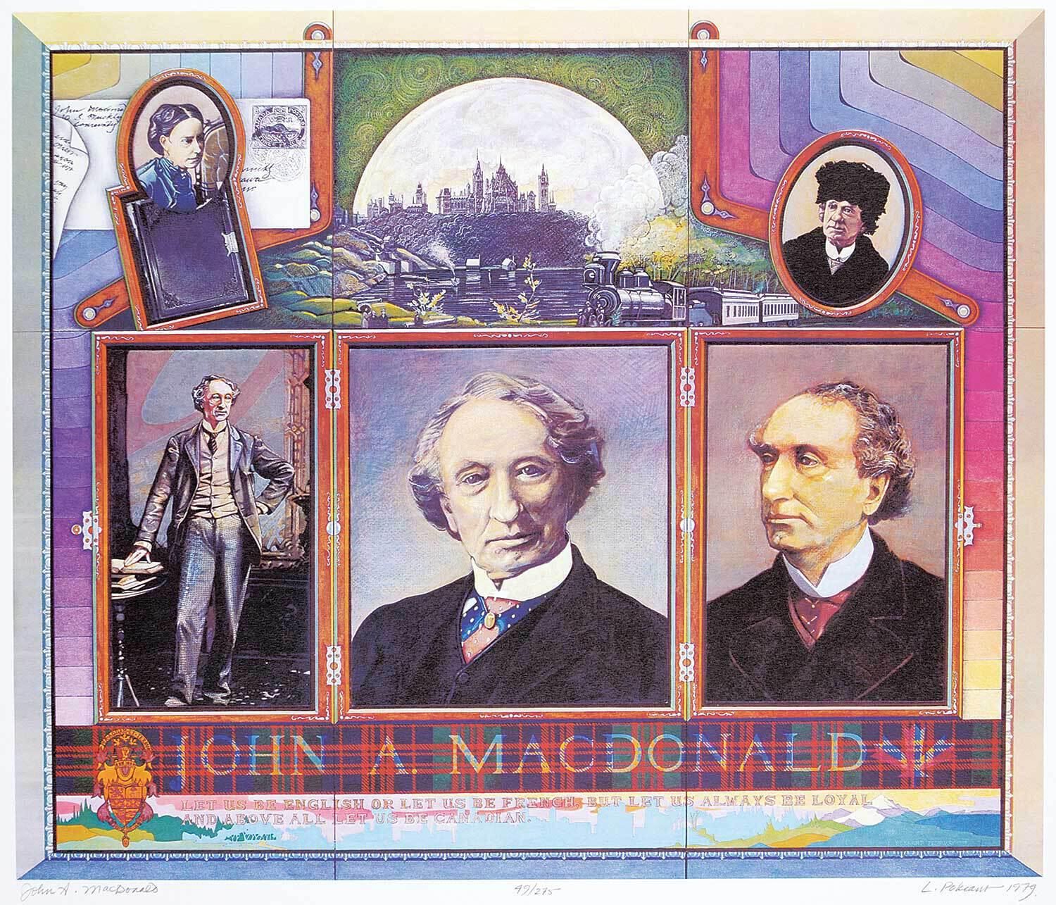 This colourful work is a tribute to Sir John A. Macdonald, the first Prime Minister of Canada (serving 1867 -1873 and 1878 -1891). He was the dominant figure of Canadian Confederation, and his political career spanned almost half a century. Without doubt, one of the most influential and important Canadians in history who achieved many successes, Macdonald was not without flaws, and in more recent years, his legacy, particularly in relation to Indigenous policies and his approach to Chinese immigration, is being re-examined.Artwork Details