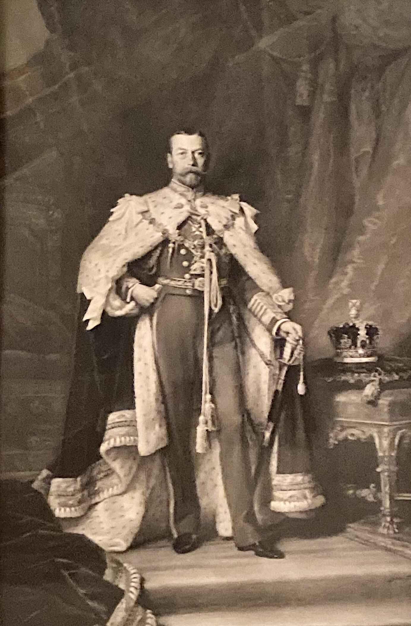 Numerous copies were made of this official portrait of the King for mass distribution to embassies, institutions, government offices, clubs, and more throughout the British Empire. George V was King of the United Kingdom and the British Dominions, and Emperor of India, from May 6, 1910 until his death in 1936, with his coronation occurring on June 22, 1911. Born during the reign of his grandmother Queen Victoria, George was third in the line of succession.