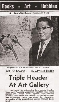 Born in Quangdong, China and a long-time resident of Victoria, B.C., Stephen Won Hung Lowe was a gifted painter, an exponent of the “Lingnan school,” a progressive and atmospheric style of painting that is a distinct artistic expression of South China. He studied at the Lingnan School of Art in Hong Kong considered at the time the leading school of modern Chinese art, under Professor Zhao Shaoang (1905-1998), a master artist in China.  After the chaos of civil war, Lowe immigrated to Canada at 18 years of age and his talent was soon evident. Through connections from his first job at the Union Club, he was sponsored for further study in Hong Kong. On his return, he taught painting at the Art Gallery of Greater Victoria, privately and at the University of Victoria. In 1970 he was invited to open his first gallery at The Empress Hotel. After his death, the family carried on Lowe’s legacy opening another branch in Calgary in 1979. The Victoria gallery closed in 2006, though the Calgary store flourishes.
