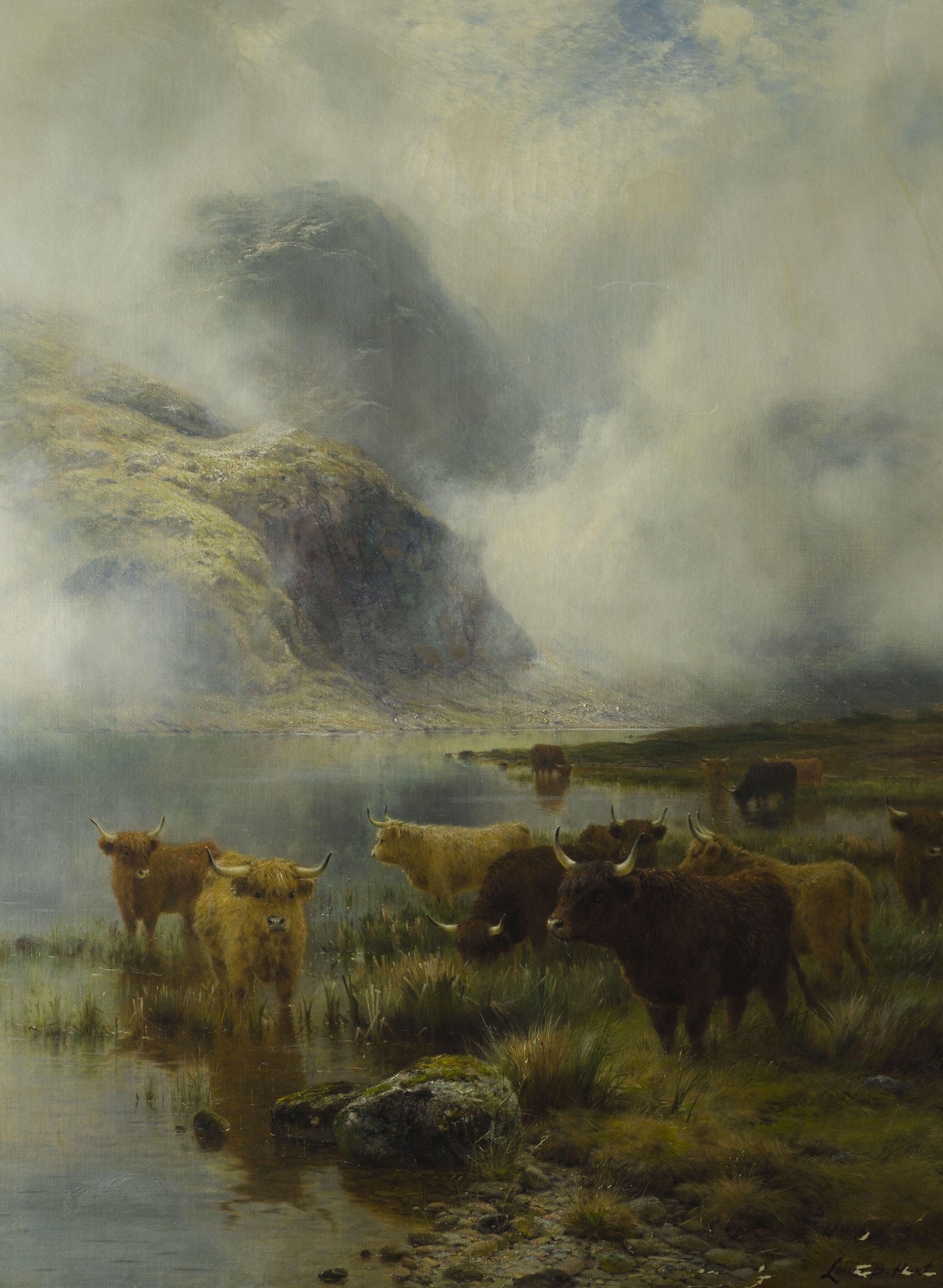 Louis Bosworth Hurt, born in Ashbourne, north Derbyshire in England, was a well-known landscape artist who painted the dramatic skies and moody mists of Scotland’s Highlands and his work is characterized by the Highland cattle that feature in his best known paintings. He was an early student of George Turner (1841–1910), also an English landscape artist who was dubbed "Derbyshire's John Constable"*, and the style of their paintings is similar. Hurt was influenced by the animal paintings of Sir Edwin Landseer RA (1802-1873) and the Scottish landscapes of Peter Graham RA (1836-1921). He continued the tradition of landscape painting established in the early Victorian period, where the Queen’s love of the Highlands initiated a vogue for paintings of those districts, thus providing subject matter that Hurt painted for his entire life.