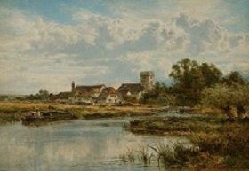 This Realist pastoral image depicts The Goring, a village on the left bank of the River Thames in the Goring Gap, South Oxfordshire, England between the Berkshire Downs and Chiltern Hills. Some villagers are visible in front of thatched and stone houses, a mill and a church (St. Thomas of Canterbury) with clumps of trees, and a narrow canal-type boat is moored along the river bank to the left. There is a small bridge on the right with trees and reeds in the foreground. It is a picturesque scene, with the sky, buildings and trees reflected in the water.Type of Painting