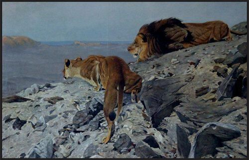 This image depicts two lions on higher ground, crouching low on the rocky terrain, and intently focused on possible prey out of sight on the plains below. The painting of a female and male lion hunting together would have been popular with the big-game sports hunting fraternity in both Europe and North America in the 18th and into the 19th century. Friese was said to have traveled to Syria and Palestine, and given the landscape depicted in this work, along with the possible range of the lions ca. 1880s, the location depicted, while unidentified, could well have been the Middle East.Type of Painting