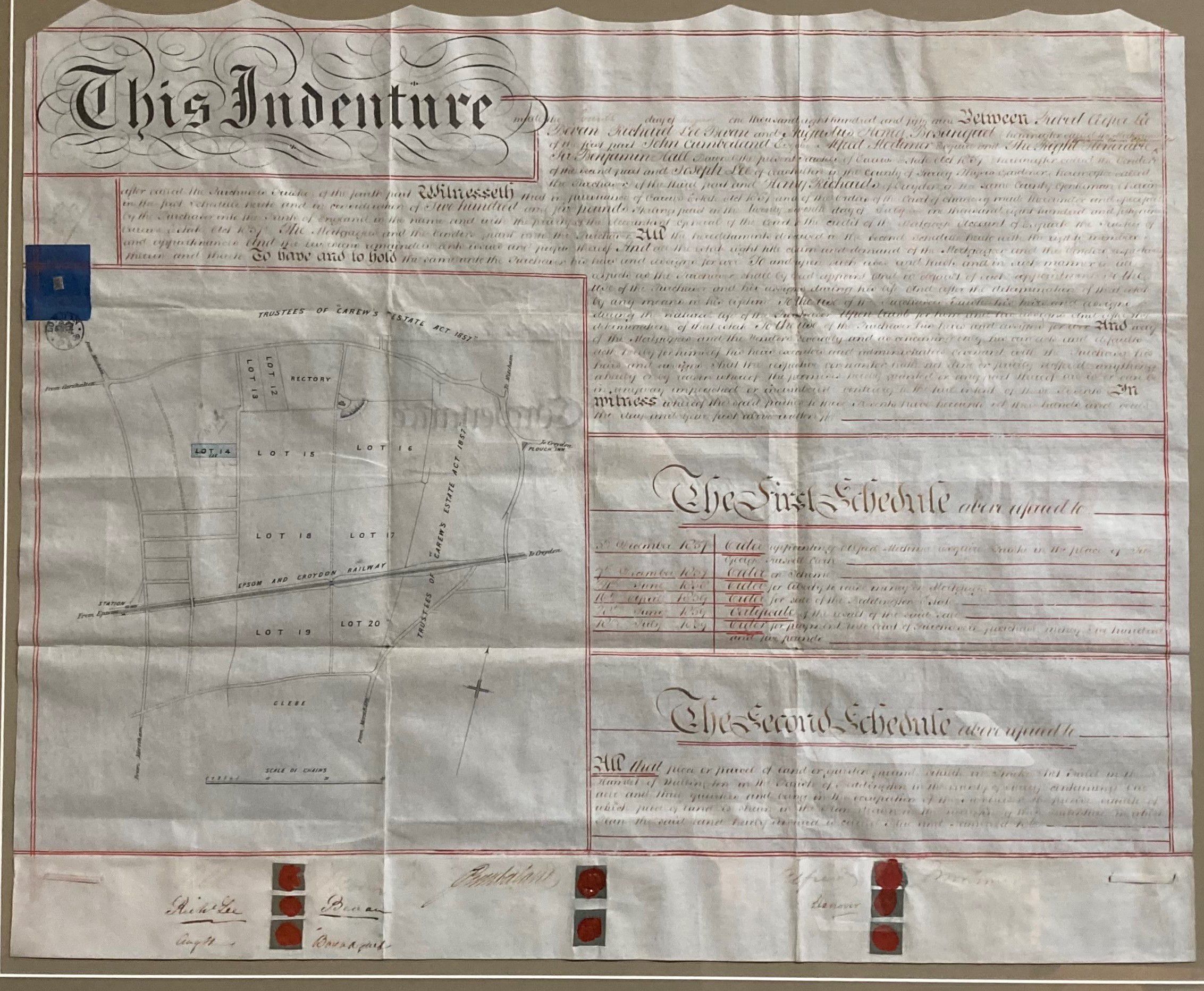 This is a land property indenture or legal contract related to the Carew's Estate bordering Epsom and Croydon Townships (now Boroughs) in Surrey, south of central London, England, dated August 4, 1859.Context