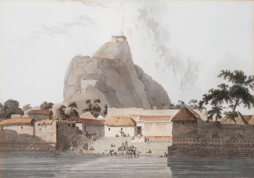 Born in Kingston upon Thames, Surrey, Thomas Daniell was an English landscape painter and printmaker. He traveled extensively in India in the company of his nephew William, with whom he collaborated on one of the finest illustrated works of the period, “Oriental Scenery and Antiquities”. Thomas began his career apprenticed to a heraldic painter before attending the Royal Academy Schools. He exhibited 30 works, mainly landscapes and floral pieces, at the Academy between 1772 and 1784, and in 1784 he obtained permission from the East India Company to travel to Calcutta to work as an engraver, accompanied by his nephew.