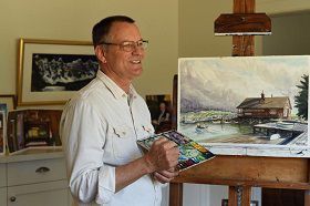 Born in Belleville, Ontario, Robert Edward Amos is one of Victoria, B.C.'s most public artists and writers, although perhaps best known as a painter. With a fine art degree from Toronto's York University, he moved west first to Vancouver, and then arrived in Victoria in 1975, working at the Art Gallery of Greater Victoria for five years, followed by a year (1980-81) of travel in Japan, Thailand and Malaysia with future wife and artist Sarah Amos. He has become one of the city’s best known artists, specializing in paintings of homes and gardens. He paints in watercolour and acrylic.