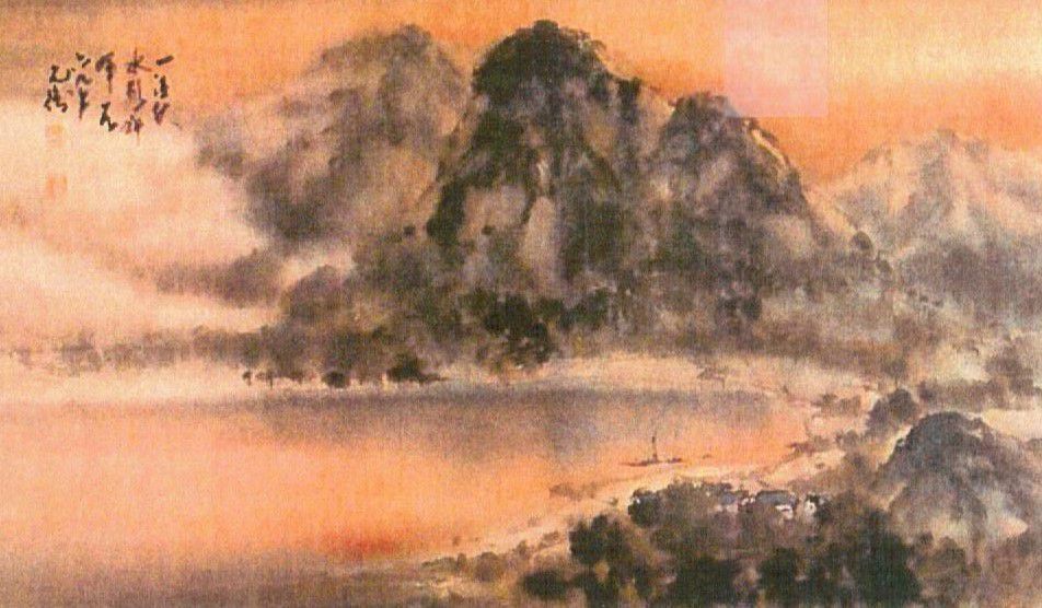 Painting This landscape depicts a coastal Chinese village in a bay, with fishing boats and large mountains, one darker and bold, in the background. The painting is atmospheric with softly portrayed trees and foliage, and shimmering water. The view is from an elevated distance, and the location is unknown.