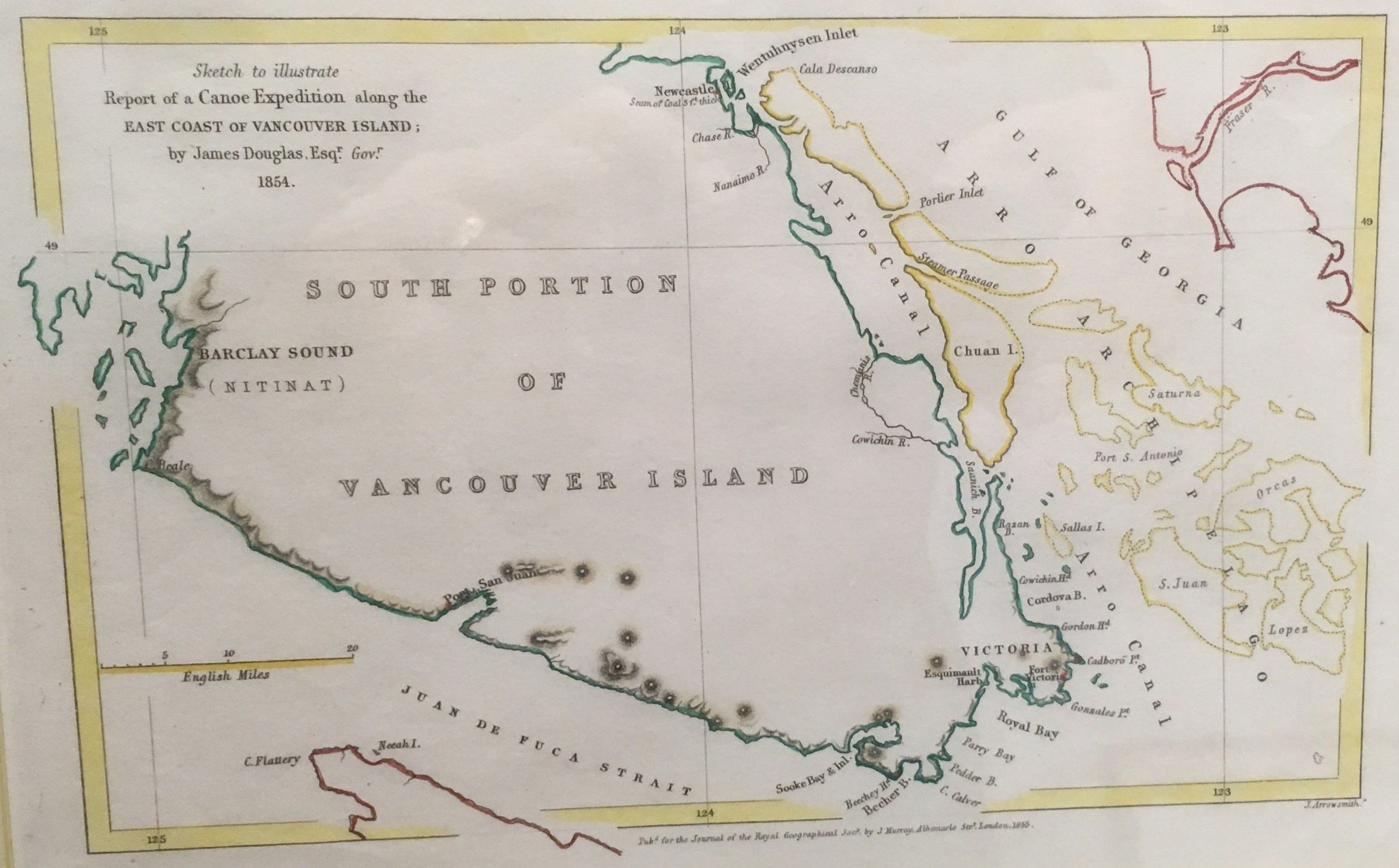 This is a hand-coloured engraving by John Arrowsmith published for The Journal of the Royal Geographical Society by John Murray, Albermarle Street, London in 1855 after a sketch done by James Douglas (Governor of the Crown colonies of Vancouver Island and British Columbia, later Sir James Douglas) in 1854 illustrating the "Report of a Canoe Expedition along the East Coast of Vancouver Island, [B.C.]"Context