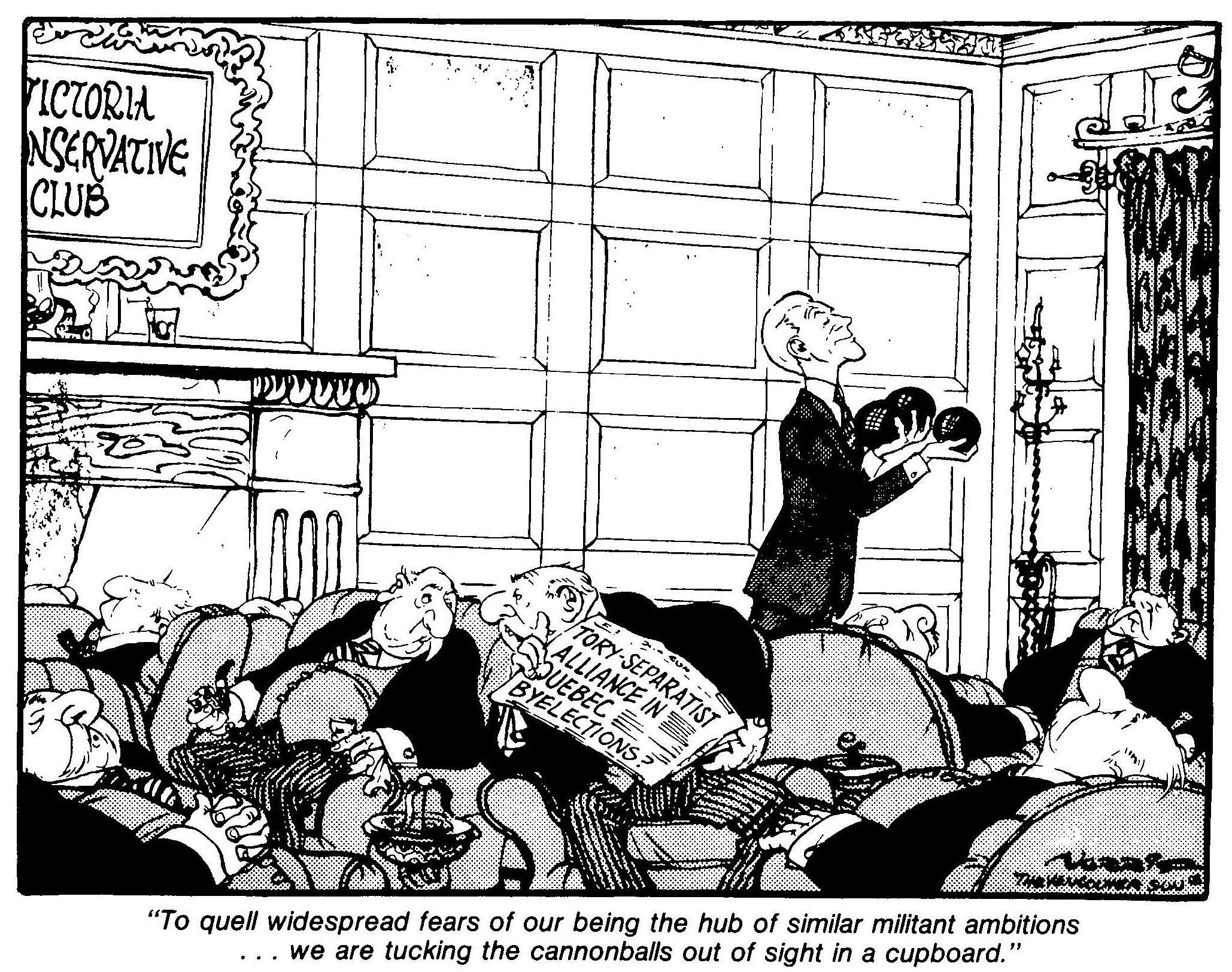 This cartoon shows a crowded gathering of elderly gentlemen members in formal dress seated in a wood-paneled reading lounge at the "VICTORIA CONSERVATIVE CLUB" [Union Club of B.C.].  The members, mostly dozing in large upholstered armchairs, are depicted as wealthy look-alike men with substantial walrus moustaches. One man with a newspaper is turned to his neighbour commenting on the headline "TORY-SEPARATIST ALLIANCE IN QUEBEC BYELECTIONS?" and a Club official in the background is walking away with three cannon balls in hand.