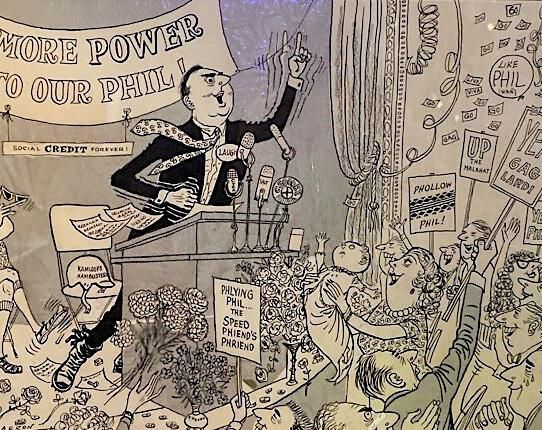 This ca. 1960 cartoon depicts Phil Gaglardi (1913-1995), sometimes known as “Flyin’ Phil” or “Sorry Phil”, a politician who served as B.C.’s Social Credit Party Minister of Highways from 1952 to 1968,  a term marked by rapid expansion of the province’s road and bridge system. He also served as mayor of Kamloops from 1988 to 1990.