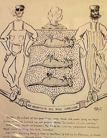ARMS: On a field of Liverpool Virus, sable, three rats, mort. Lying on their backs, with toes turned up, all proper. Motto – “De mortuis nil nisi smellum.”
