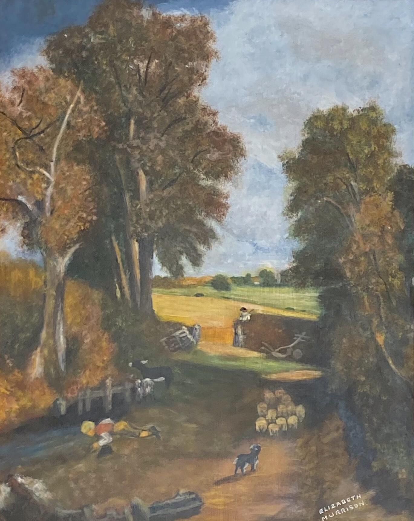 The artist's reference to "Constable" in her painting's title is to John Constable RA (1776- 1837), the famous English landscape painter in the Romantic tradition. Born in Suffolk, he was largely responsible for reviving and revolutionizing the genre of landscape painting in the 19th century with his pictures of the area surrounding his home, known as "Constable Country", which he invested with an intensely personal vision.