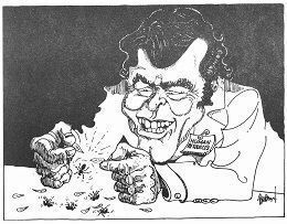 Bierman was recognized as a courageous champion of the downtrodden. And in 1978, a statement by the then B.C. human resources minister (later premier 1986-1991), Bill Vander Zalm, inspired a Bierman cartoon that became famous as the first cartoon in Canada to be the subject of a libel suit. Vander Zalm said young people should be cut off welfare, and that First Nations youth should go back to their reserves. In response, Bierman depicted the minister happily pulling the wings off flies in a scathing cartoon published in The Victoria Times. Vander Zalm sued both the newspaper and the cartoonist for libel. The judgement was initially made for Vander Zalm and the decision generated outrage among cartoonists and journalists across the country and beyond. The case ultimately went to the B.C. Court of Appeal where the original decision was overturned and upheld a cartoonist’s right to engage in satire and hyperbole.