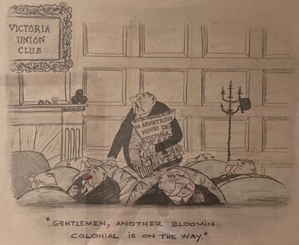 This humourous cartoon shows a gathering of seated elderly mustachioed gentlemen in formal dress at the "VICTORIA UNION CLUB". The one man standing with a newspaper is commenting ("...GENTLEMEN, ANOTHER BLOOMIN COLONIAL IS ON THE WAY") on the headline (W. ARMSTRONG MOVES TO VICTORIA). The specific issue or context is not known. The man to the left smoking a pipe is depicted with an impressive bulbous red nose.