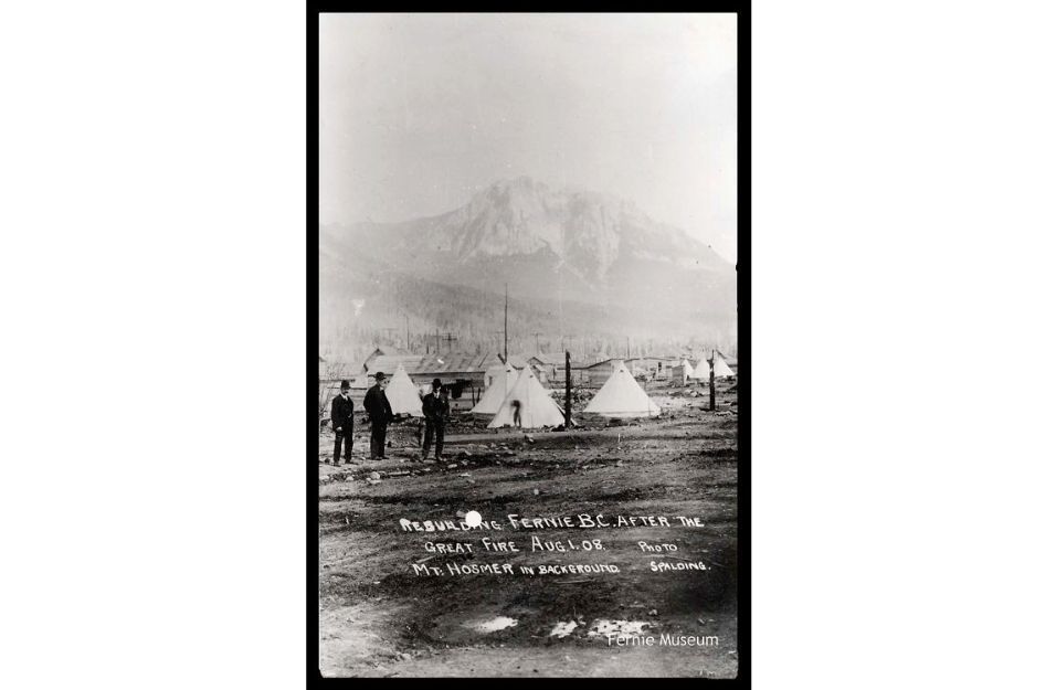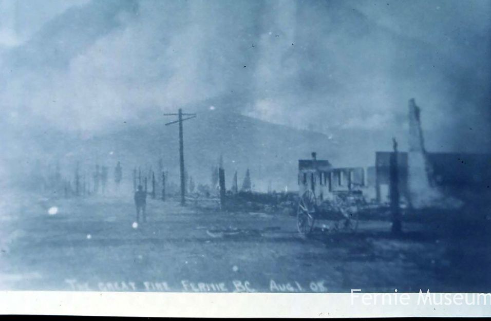 "The Great Fire of 1908 was a dramatic, defining moment for Fernie that saw the community obliterated by fire in less than 90 minutes on August 1st, 1908. The fire claimed no lives*, but the property loss was valued at over $5 million dollars, a staggering amount at the time. It was the second major fire in four years. In 1904, a fire destroyed much of Fernie’s commercial core and led to the incorporation of the City of Fernie and the formation of the Fernie Fire Department.