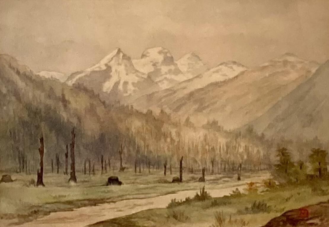 This image depicts a devastated Fernie in the East Kootenay region of southeastern B.C., after the Great Fire of 1908. This landscape has almost a woodblock print quality with its strong design and depiction of the mountains. The colours are greyed and muted, as though viewed through a haze of ash and smoke, reminiscent of Joseph Spalding's photographs of the event and its afternmath.