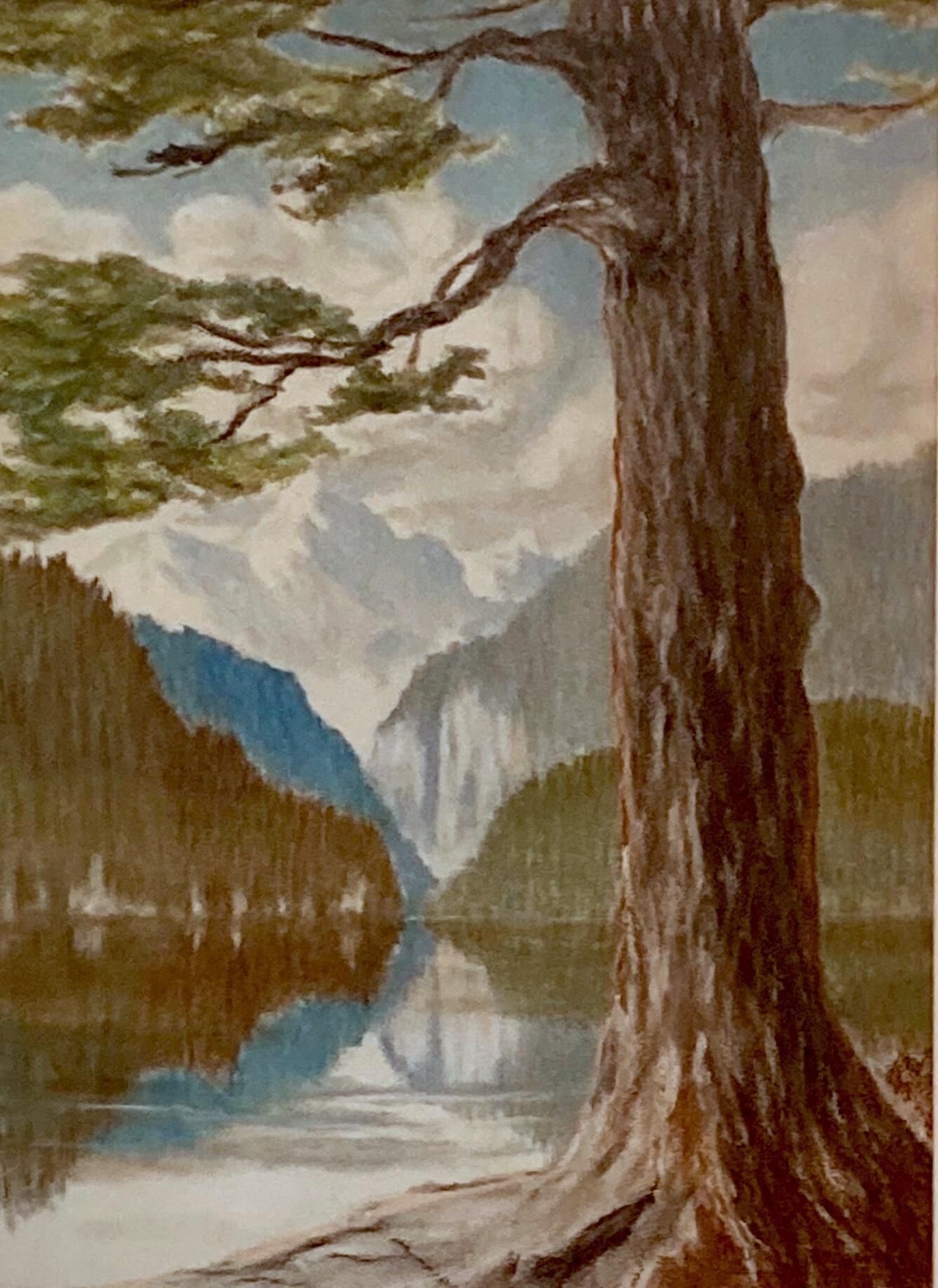 This landscape scene depicts a massive tree in the foreground that frames the treed layered hills and mountains reflected in the water, as well as the clouds and snow-peaked mountains in the distance. The serene image has an illustration quality in that it appears to faithfully and clearly represent a landscape as seen, albeit with a subtle studied approach and palette. The specific location in B.C. is unknown.Artwork Details