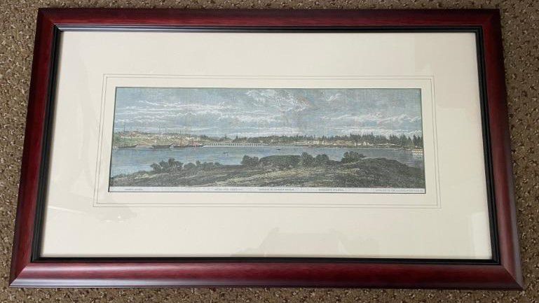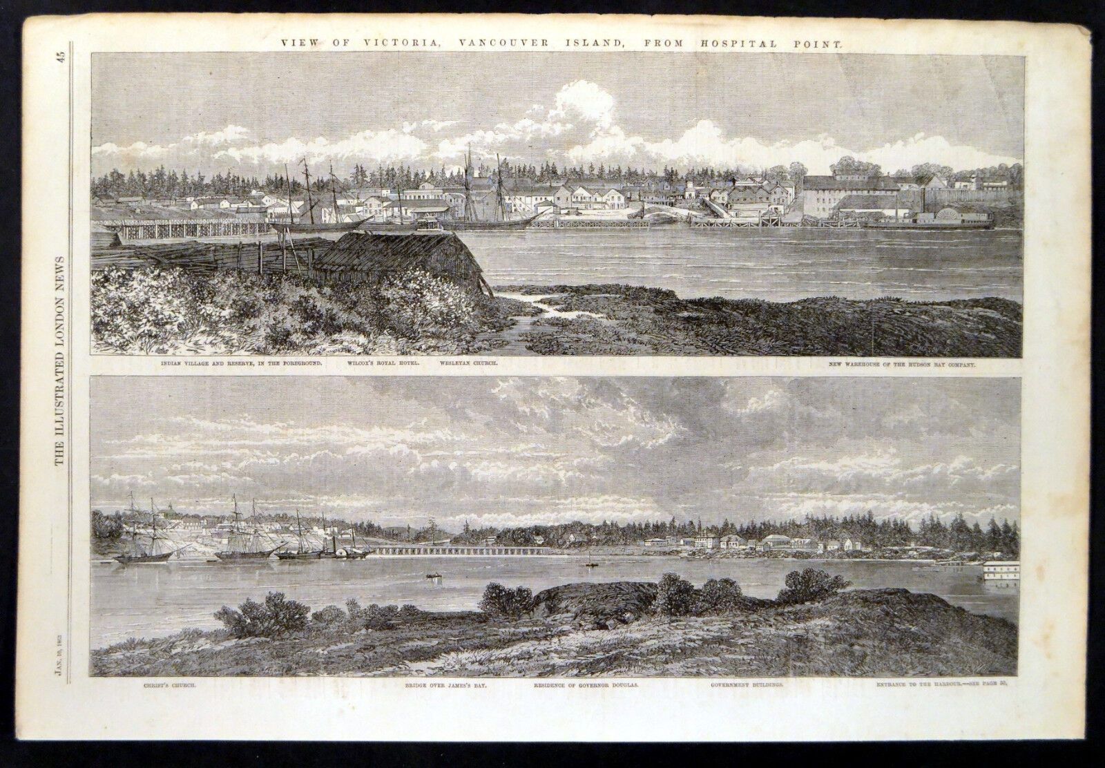 Tinted engraving on paper (ca. 1863) by Mason Jackson (attrib.) from drawing by Edmund Morison Wimperis for The Illustrated London News (Jan. 18, 1863, page 45) after part two of four-part photograph “Panorama from Songhees Point 1861-62” (date may be 1860-61) by George Robinson Fardon.