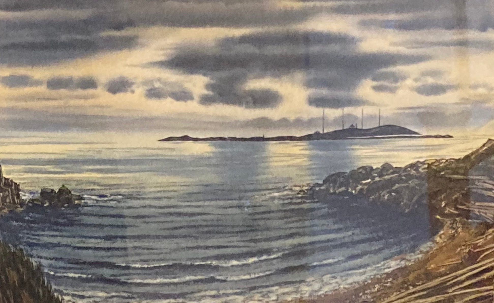 This marine landscape depicts a view from the shore in an eerie light likely from Beach Drive in the north across Enterprise Channel to the barren Trial Islands, a group of two plus islands located off the south-eastern tip of Vancouver Island off Victoria, part of the municipality of Oak Bay in Greater Victoria. The Olympic and Cascade mountain ranges in the U.S. Washington state are visible in the distance. Together, the islands form the Trial Islands Ecological Reserve and access outside of designated zones is prohibited.Type of Painting