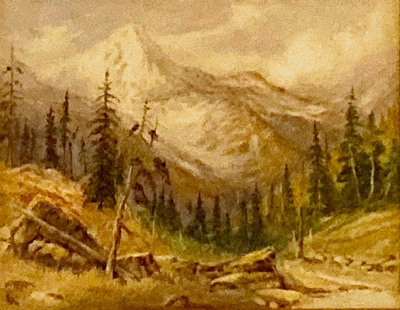This landscape depicts a snow-covered mountain view through a partially-forested deep valley.  The location is unknown.Artwork Details