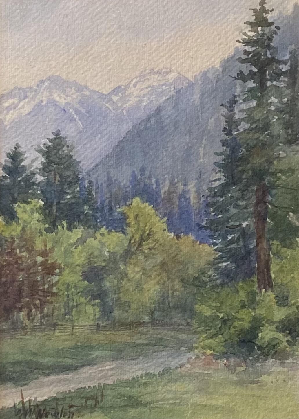 This image depicts a treed landscape with a curved stream in front of some fencing and heavy forest with snow-topped mountains in the distance. The location is unknown, but likely Vancouver Island.Artwork Details