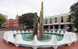 Wilkinson twice ran his own art school in Victoria, but perhaps his greatest mark on the local and provincial art scene came while working in the 1960s as staff artist and senior architectural draughtsman in the Provincial Department of Public Works.  As chairman of the Provincial Committee on Art for two years, Wilkinson launched a period of intense activity with art policy for the provincial government and oversaw the purchase of 600 works for the provincial collection, and also arranged major art commissions for new provincial buildings. He was involved in Victoria’s Centennial Square revitalization and development project, designing the huge focal point fountain with mosaic monolith totems in 1965. It was commissioned and gifted by the municipalities of Saanich, Oak Bay and Esquimalt in commemoration of the Centennial of the founding of the City of Victoria in 1862. He was also known for other major commissions, including a large bronze sculpture for the B.C. Provincial School for the Deaf in Burnaby, murals at the B.C. Institute of Technology, sculptures for the Quesnel courthouse and Bull River Fish Hatchery, and the Royal B.C. Museum’s Carillon tower.