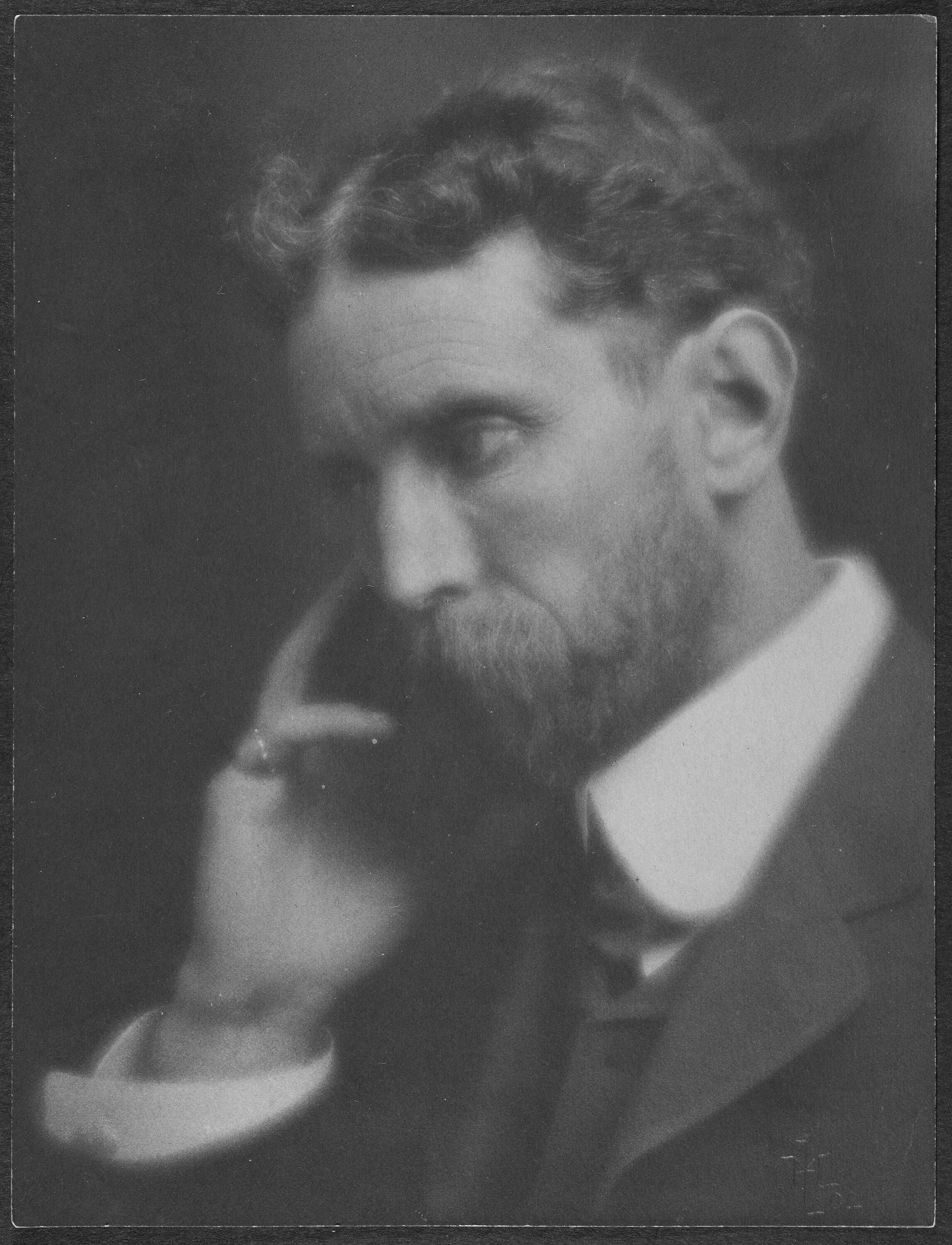 This black and white Pictorial-style image shows Samuel Maclure (1860-1929), a well-known B.C. architect and painter. He was a self-taught architect of over 450 commissions and is best known for his Tudor Revival and Craftsman style houses. As a painter, he documented local landscapes and did First Nations portraiture in watercolour. This photograph is a head and shoulders 3/4 view. He is pensive, sporting a suit with white shirt and tie and is leaning on his right hand revealing a pinkie ring. Maclure was a member of the Union Club.Photograph Details