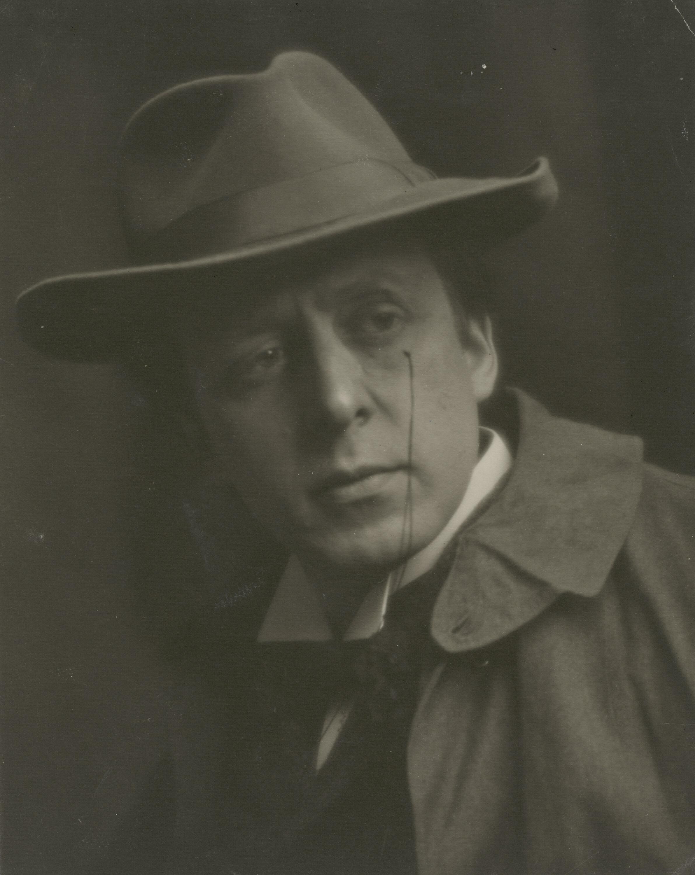 Photograph Photographic reproduction (2015) from the 1904 b/w photograph entitled "Study no. 7 : H.M.L." by Harold Mortimer-Lamb. This black and white Pictorial-style image shows James Jervis Blomfield (1879-1951), an English-born Canadian artist and designer. It is a 3/4 head and shoulders view of Blomfield with a monocle, and he is wearing a fedora and raincoat, with suit, white shirt with turn-point collar and a bow tie.