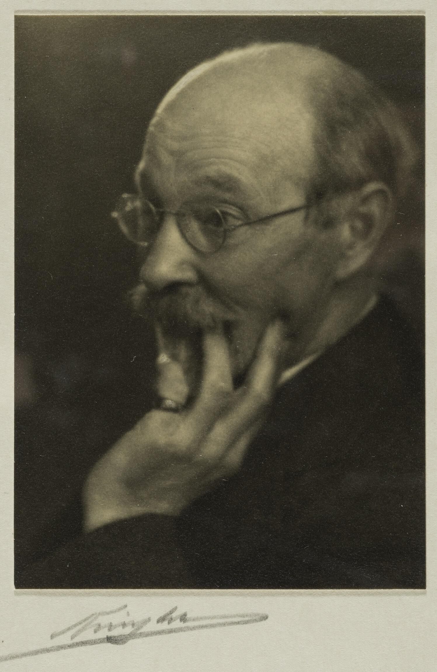 This black and white Pictorial-style portrait is of English-born, Harold Mortimer-Lamb who was, in the early 20th century, the leading artistic photographer in Canada, a proponent of Pictorial photography.  He was also a successful mining engineer, journalist and artist perhaps best known for championing the Canadian Modernist Group of Seven in the 1920s. This image of a pensive Mortimer-Lamb, a 3/4 head and shoulders view. He is wearing a dark suit, glasses and is partially leaning on his left hand.Photograph Details