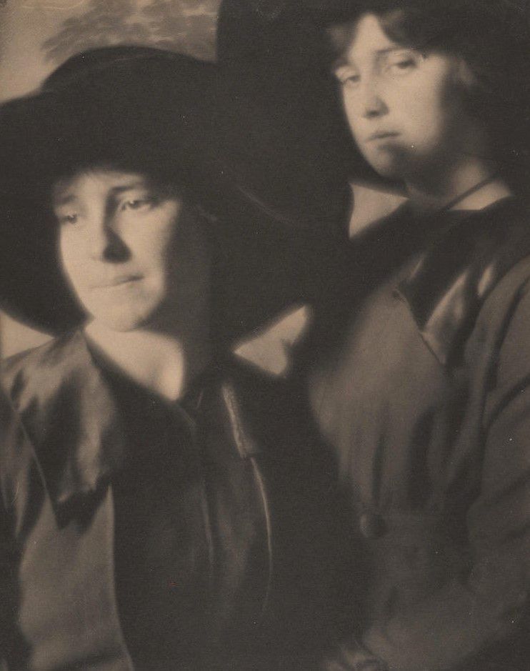 Photograph Photographic reproduction (2015) from the 188? b/w photograph by Harold Mortimer-Lamb. This black and white Pictorial-style portrait is of two young women (unidentified) standing close together, each in a head and shoulders 3/4 view. They are wearing dark coats with satin collars and large-brimmed dark velvet hats. Both are partially turned, the left woman looking to her right, and the right woman looking to her left. Both appear sad and pensive.