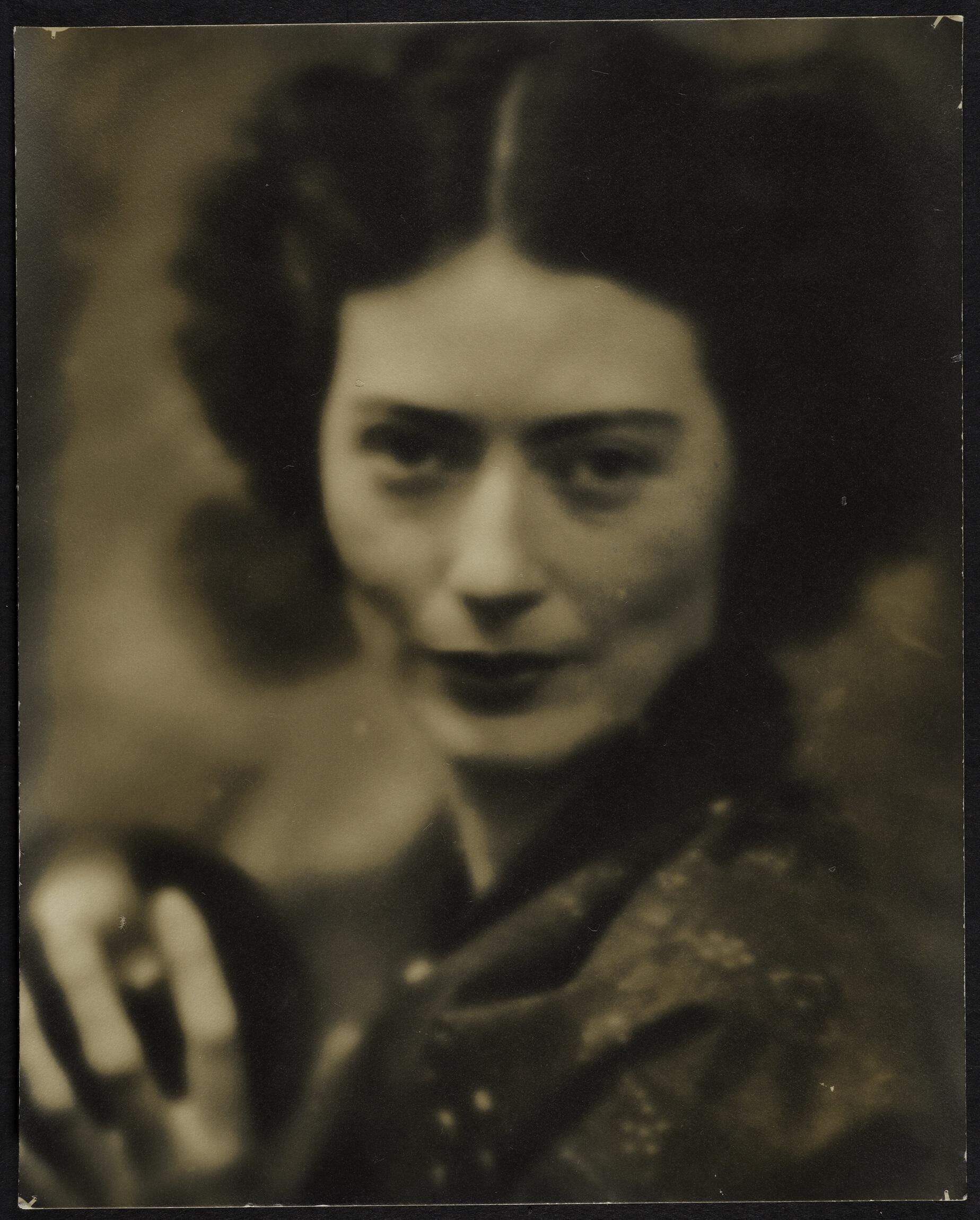 Photograph Photographic reproduction (2015) from the undated b/w photograph by Harold Mortimer-Lamb. This black and white Pictorial-style image is of Vera (Olivia) Weatherbie (1909-1977), an artist and the second wife of photographer Mortimer-Lamb. It is a head and shoulders sideways view and she is gazing intently at the viewer while holding a dark glass globe.