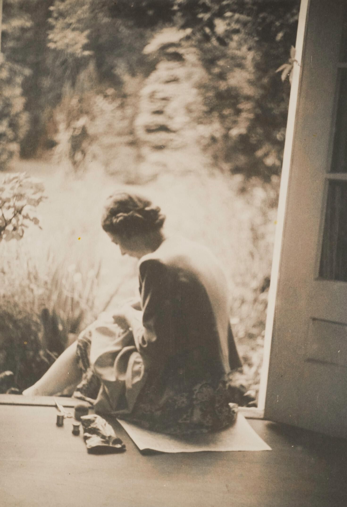 Photograph Photographic reproduction (2015) from the undated b/w photograph by Harold Mortimer-Lamb. This black and white Pictorial-style image shows Vera (Olivia) Weatherbie (1909-1977), an artist and the second wife of photographer Mortimer-Lamb, seated on a newspaper in a doorway mending, with a garden in the background. It is a 3/4 back view and she has sewing/mending supplies on the floor beside her, likely taken in the family home in Vancouver.