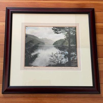 This hand-tinted black and white photograph depicts Sproat Lake in central Vancouver Island, B.C. The image shows a tranquil lake though trees with forested shores in the distance. Today, in addition to lakeside homes, the lake has three provincial parks on its shores: Sproat Lake Provincial Park, Taylor Arm Provincial Park, and Fossli Provincial Park. Best known for being a scenic vacation spot, the Fossli park has several petroglyphs.Photograph Details