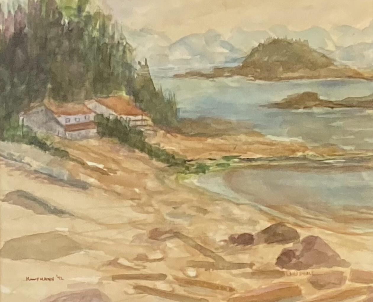 This image depicts the beach at Lantzville, a seaside community on the east side of Vancouver Island, B.C. north of the City of Nanaimo. The painting has a layered composition showing a deep expanse of beach with rocks and logs in the foreground, several large multi-story buildings to the left with trees in the middle ground moving to islands, the ocean and mountains in the distance.Artwork Details