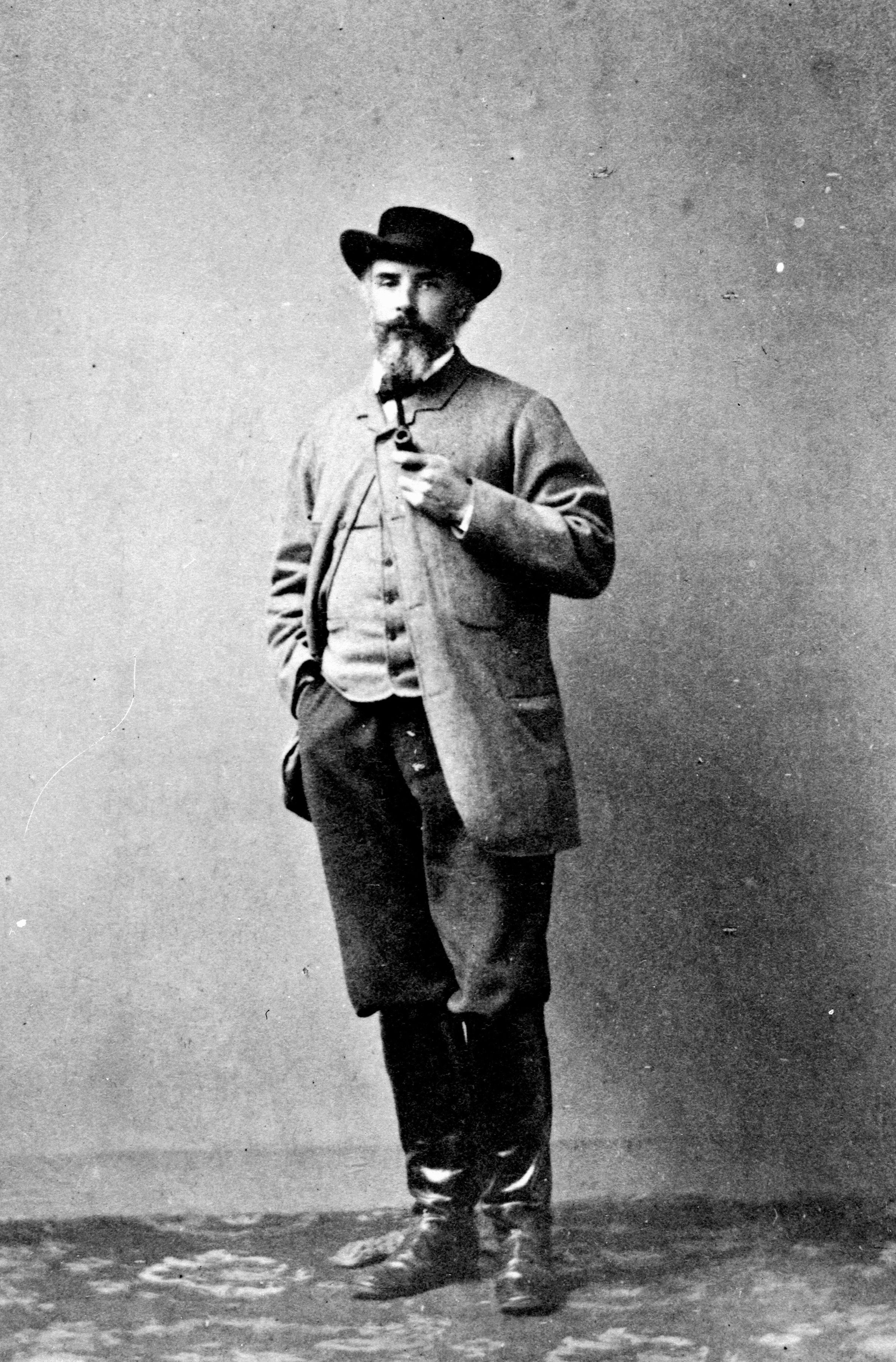 It is a full-length portrait, with Begbie slightly turned to the left. He is wearing a hat, long jacket and vest and his pants are tucked in to high leather boots. He is holding a pipe in his left hand and his right hand is in his pant's pocket.Photograph Details