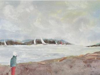 This image depicts a greyed and windy seascape with eight sailboats and a lone onlooker to the left on a sandy beach wearing red pants, a green jacket and a white hat. It is a strong diagonal composition with the eye drawn to the onlooker figure, then along the beach and out across the choppy waters to the boats and the islands, the mountains in the far distance and the threatening sky with its yellow-green highlights. The location is unknown.Artwork Details
