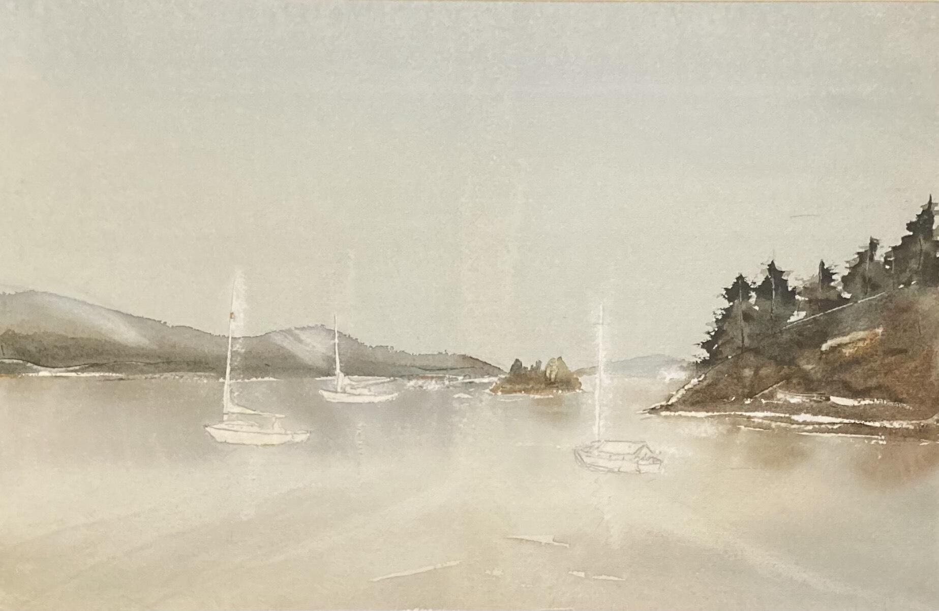 This unfinished seascape depicts sailboats in a bay surrounded by treed and rocky land/islands. The sailboats are incomplete images giving the work a ghostly quality. The location is unknown.Artwork Details