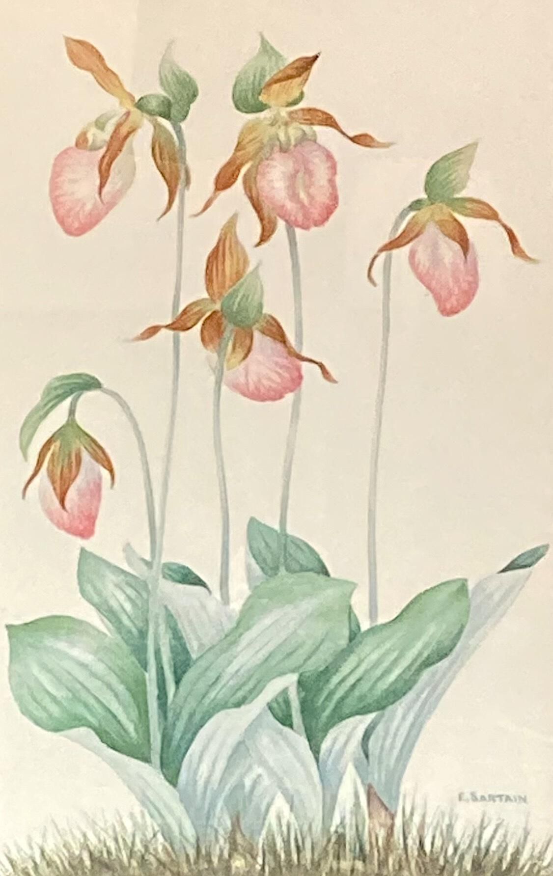Later moving to Victoria, she continued her painting and exhibitions, and as a conservationist worked to preserve the many unique wildflowers growing on Vancouver Island and elsewhere in Canada. Sartain was a traditional watercolourist who painted her floral portraits with a delicacy and accuracy few painters could duplicate. She was also prolific, reported to have produced 5,000 watercolours of various sizes, mostly on a commission basis. As her recognition at home and internationally increased, paintings were purchased by the British Columbia government and others to be offered as gifts to royalty and others. Sartain was a member of of the Island Arts and Crafts Society and the Victoria Sketch Club.
