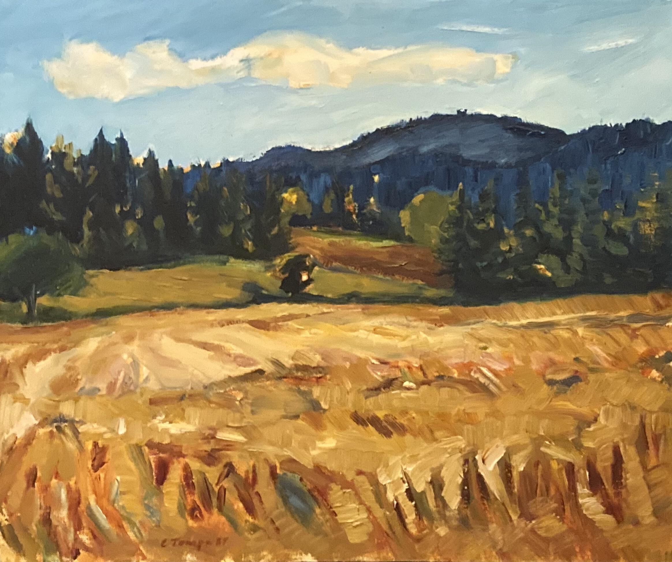 This colourful image is a view across hayfields to hills at Woodwyn Farm in Saanich which was returned to the Tsartlip First Nation by the Province of B.C. in 2020. Saanich is a district municipality on Vancouver Island within the Greater Victoria area. The landscape is painted in broad strokes and divided roughly in thirds from bottom to top, golds, greens and blues.Type of Painting