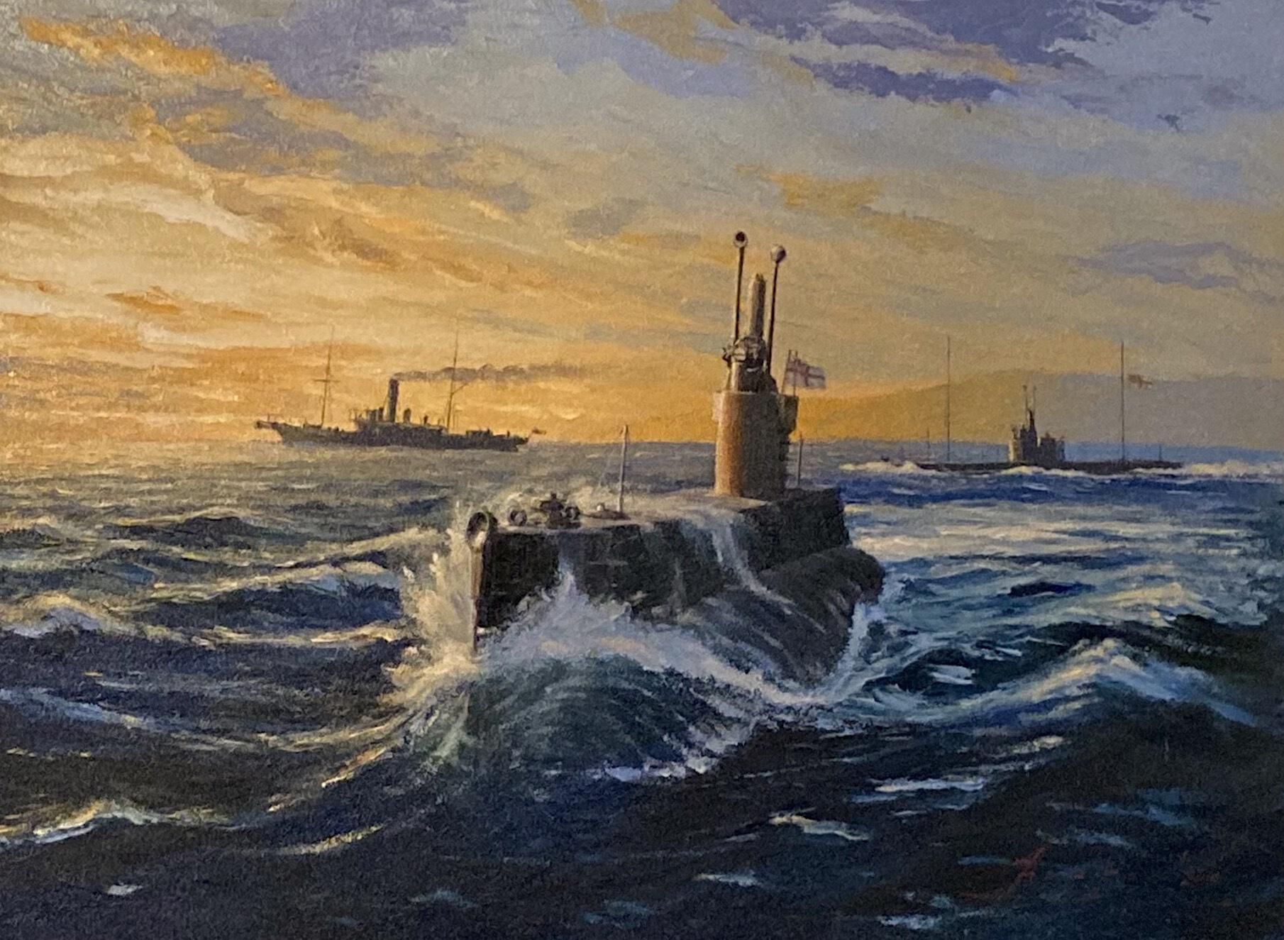 This painting commemorates the founding of the Royal Canadian Navy's Submarine Service that began with a meeting at the Union Club of British Columbia with B.C. Premier Sir Richard McBride and others, on July 29, 1914, six days before the declaration of World War I. Originally named Iquique and Antofagasta, the two submarines were built in Seattle for the Chilean government. However, the Chilean deal fell through and the submarines were purchased by the B.C. premier. The Dominion government ratified the purchase and on August 6, 1914 the two boats were commissioned as CC1 and CC2 because of their resemblance to the British "C" class submarines.