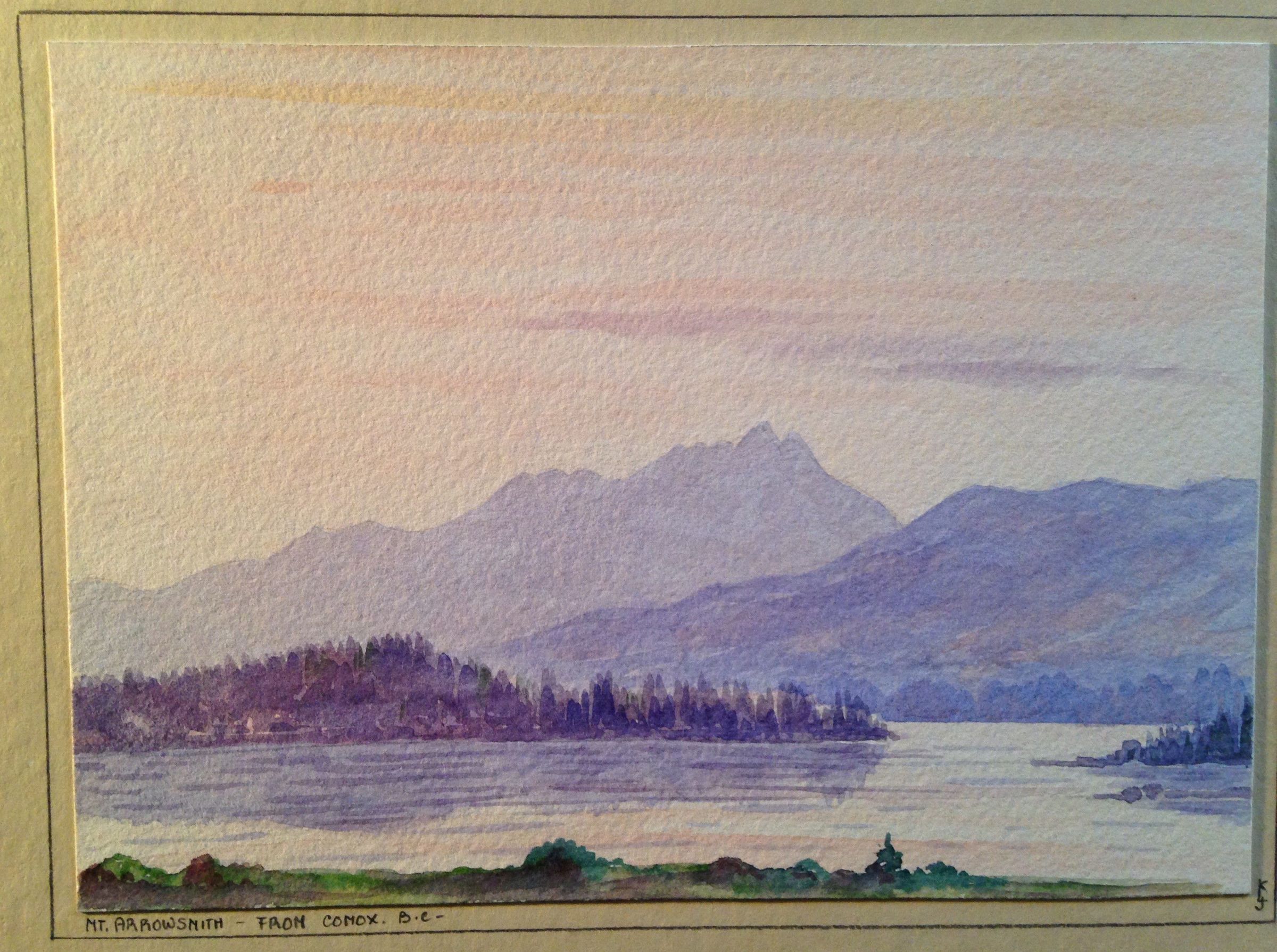 This landscape view depicts Mount Arrowsmith in the distance, the highest mountain east of Port Alberni on Vancouver Island, from Comox, B.C. The painting shows a tranquil blue-purple vista across waters southward down the Island.Artwork Details